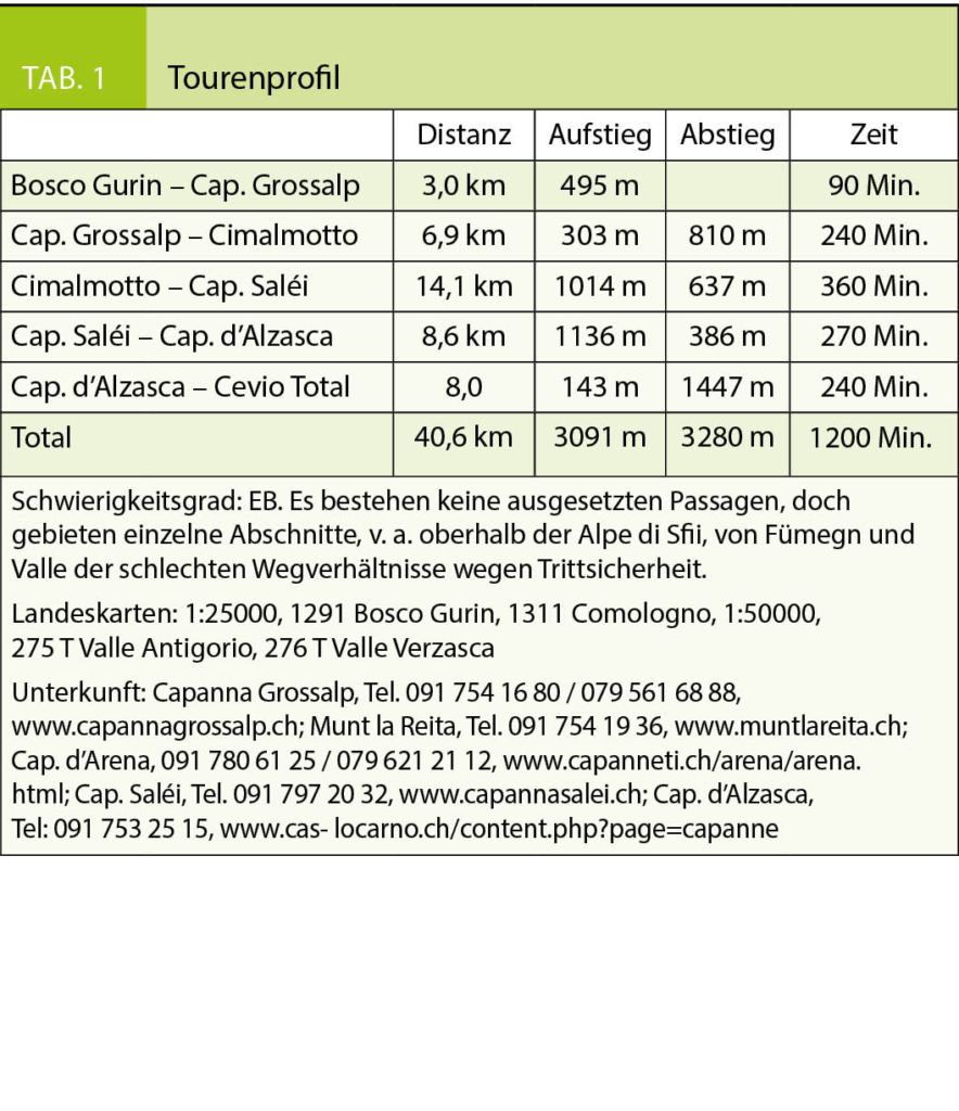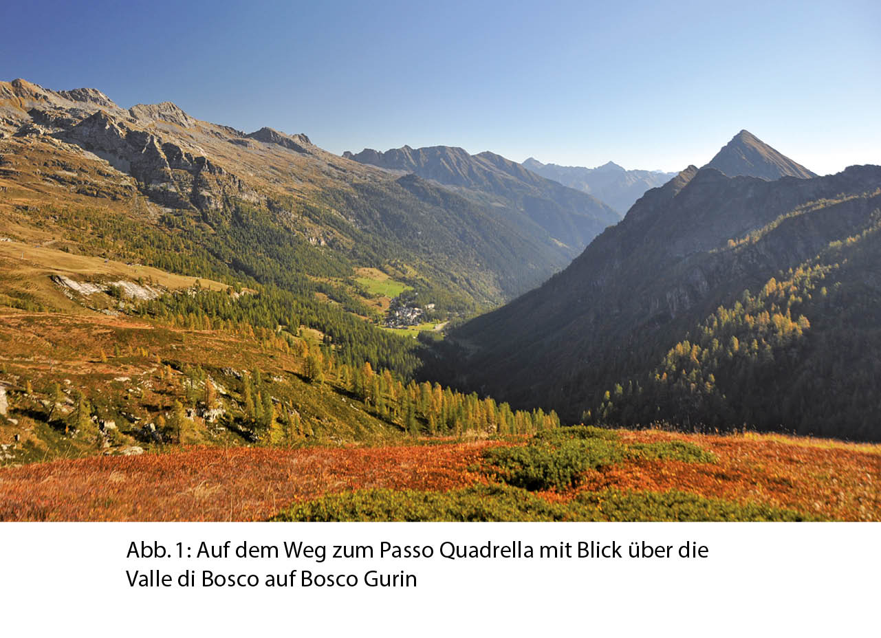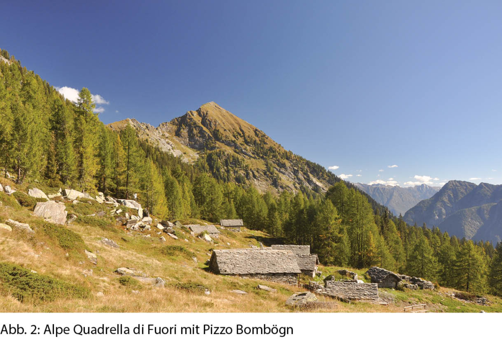Der zweite Tag erwartet uns mit einer herrlichen Traverse hoch über dem Valle di Bosco zum Passo Quadrella hinüber (Abb. 1). Der Blick reicht weit über den Pizzo Bombögn hinaus bis zum Piz Bernina und Monte della Disgrazia. Gut einzusehen ist die 300 Meter lange und zwei Meter hohe Weidemauer am Bombögn. Diese wurde 1948 zum Schutz gegen die Ziegen aus Bosco Gurin und Cerentino errichtet, die immer wieder Schäden in den dringend notwendigen Aufforstungen unterhalb des Sasso Rosso verursachten. Der frühere Kahlschlag hatte zur Folge, dass sich der Boden um Campo und Cimalmotto um mehrere Zentimeter pro Jahr senkte und das abrutschende Gelände oberhalb der Rovana die beiden Dörfer bedrohte.