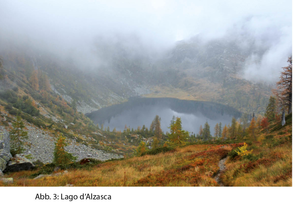 Am nächsten Morgen überraschen uns balzende Auerhähne vor der Hütte! Den Abstieg nach Zott im Vergeletto bewältigen wir schwebend und die Knie schonend mit der Seilbahn. Durch die Valle della Camana steigen wir vorerst gemütlich bis Fümegn und dann steil bis zur Alpe di Doia auf. Oberhalb dieser Alp legt sich der Hang kurz zurück, bevor wir nochmals stotzig die Bochetta di Doia erreichen. Von hier aus ist es nicht mehr weit bis zum malerischen Lago d’Alzasca und der gleichnamigen SAC-Hütte, wo wir die letzte Nacht verbringen (Abb. 3). Die Hüttenwarte Renato und Dante verwöhnen uns auch hier mit Salat, Spezzatino und Pasta sowie erneut einer himmlichen Variation von Tiramisu. Die heisse Dusche, übrigens an allen Übernachtungsorten möglich, ist hier ein besonderes Vergnügen, weil sie einer Lawine wegen unter freier Luft und Aussicht erfolgt!