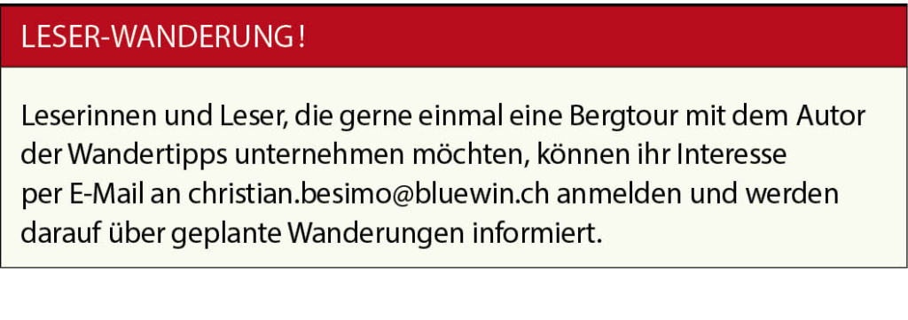 In dieser Rubrik werden Berg- und Schneeschuhwanderungen vorgestellt, die in der Regel wenig bekannt sind, zu aussergewöhnlichen Orten führen und die Genugtuung einer besonderen persönlichen Leistung bieten, sei es, dass man sich am Abend nach der Arbeit noch zu einer kleinen körperlichen Anstrengung überwindet, bzw. sich in ein oder zwei Tagen abseits breit getretener Wege unvergessliche Naturerlebnisse erschliesst. Zur besseren Beurteilbarkeit des Schwierigkeitsgrades der Tourenvorschläge wird jeweils eine Einschätzung anhand der SAC-Skala für Berg- (B, EB, BG) und für Schneeschuhwanderungen (WT 1–6) gegeben. Die schwierigste Wegstelle, unabhängig von ihrer Länge, bestimmt jeweils die Gesamtbewertung der Route. Letztendlich bleibt aber jeder selbst für die Beurteilung seiner Fähigkeiten und Eignung für die vorgestellte Wanderung verantwortlich. Die Gehzeiten sind Richtwerte und gelten für normal trainierte Wanderer. Sie müssen nicht zwingend mit den Angaben auf Wegweisern übereinstimmen.