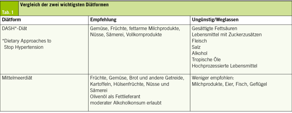 einerseits die DASH-Diät (Dietary Approaches to Stop Hypertension), andererseits die Mittelmeerdiät (26) (Tab. 1). Beide sind charakterisiert durch einen hohen Anteil an frischen Gemüsen und Früchten, vermehrtem Fasergehalt, Reduktion der gesättigten Fette und Erhöhung der ungesättigten Fette.