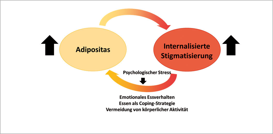Dramatischerweise ist noch immer der Irrglaube weit verbreitet, dass Übergewicht und Adipositas eine Folge unzureichender Willensanstrengung seien und dass sich betroffene Menschen «einfach mehr anstrengen, weniger Essen und mehr bewegen sollten». Dies hat zur Folge, dass Menschen mit Adipositas nicht nur im gesellschaftlichen Rahmen sondern auch und gerade im Gesundheitssektor eine massive Stigmatisierung erfahren, die, zunächst externer Natur, über die Zeit internalisiert wird. So machen sich Menschen mit Adipositas sehr häufig grosse Selbstvorwürfe in Hinblick auf die eigene Gewichtsentwicklung und werten sich selbst ab. Dies kann in eine gefährliche Spirale münden, die sowohl Folge als auch Ursache der Adipositas ist und wodurch emotionales Essverhalten, Essen als Coping-Strategie und eine Vermeidung der Exposition durch körperliche Aktivität gefördert werden aufgrund einer Zunahme von psychologischen Stressfaktoren (Abb. 1).