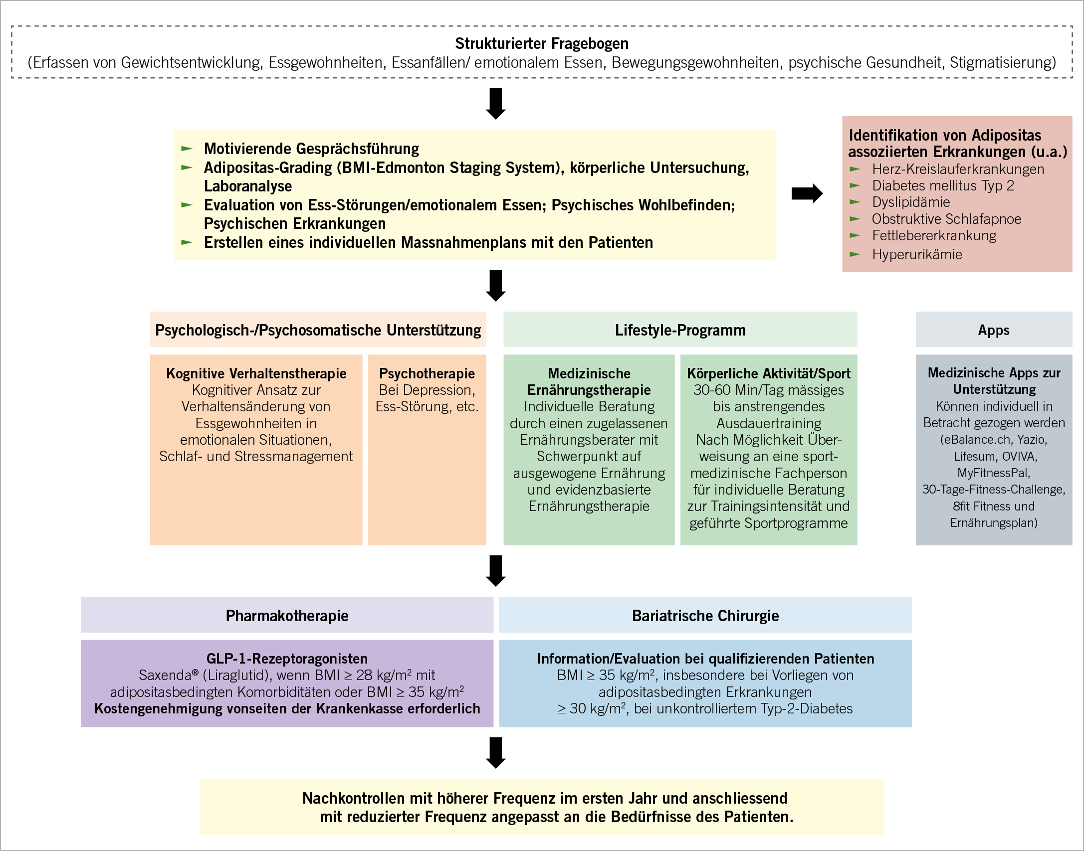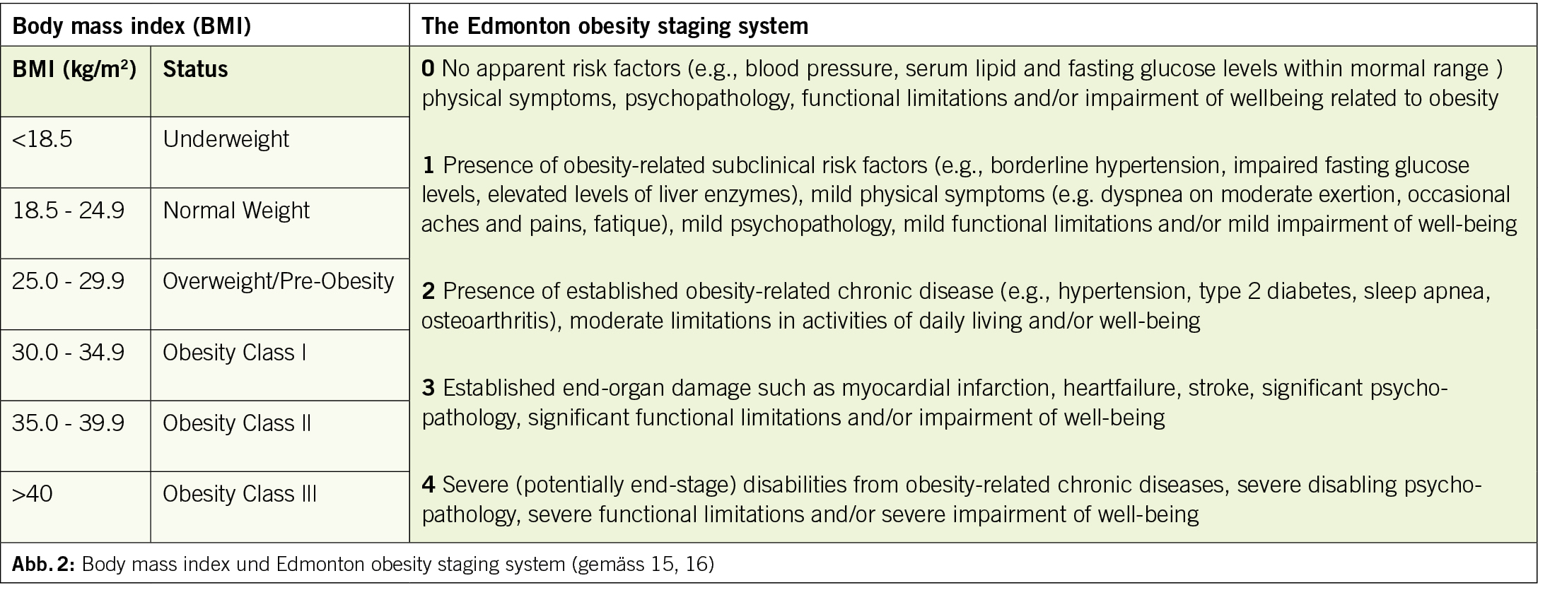 Übergewicht und Adipositas werden weithin gemäss dem sogenannten Body Mass Index (BMI, kg/m2) klassifiziert, wobei es sich hierbei nur um eine sehr grobe Einteilung handelt, welche durch die zusätzliche Anwendung des «Edmonton obesity staging systems», das den Folgeerkrankungen der Adipositas Rechnung trägt, sinnvoll ergänzt wird (Abb. 2).