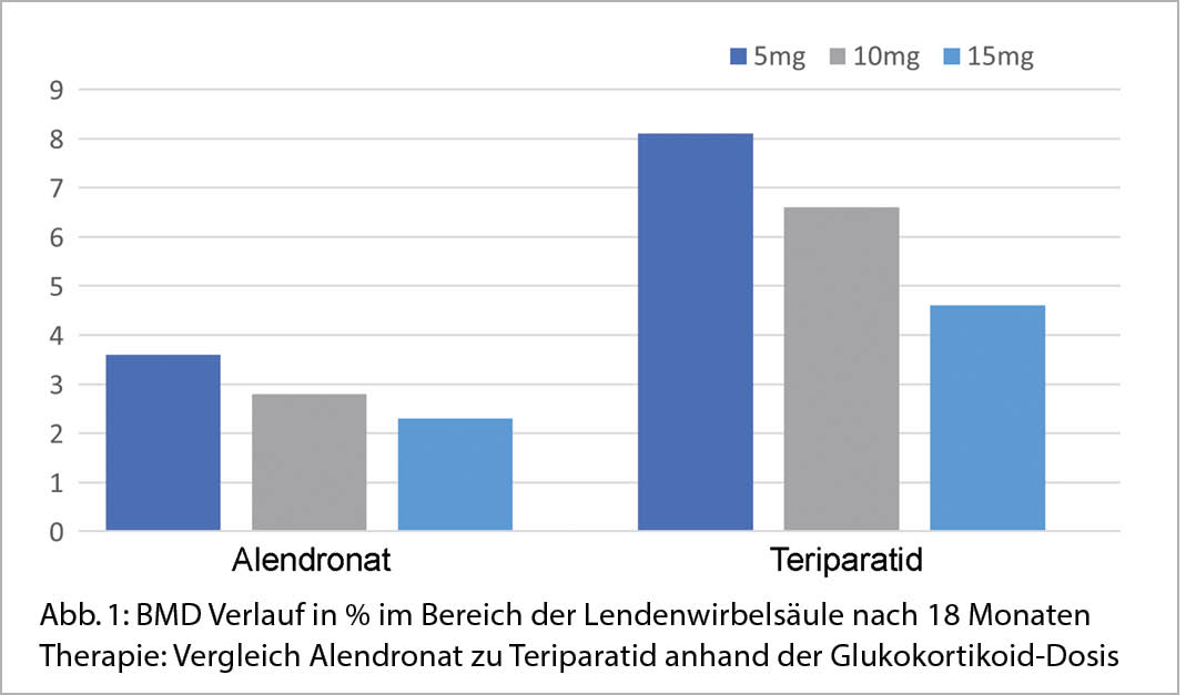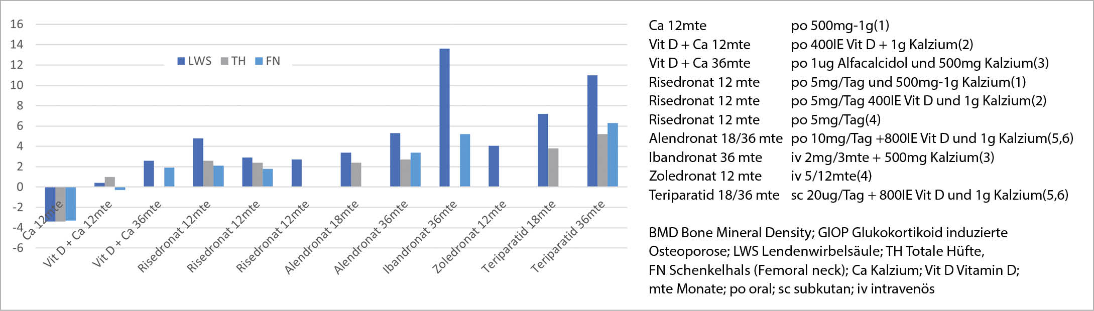 Der Wirkungsvergleich von ALN (70 mg pro Woche) mit Teriparatid (20ug pro Tag) während einer GC-Therapie (>=5mg Prädnisolonäquivalent) zeigte unter Teriparatid eine ausgeprägtere Knochendichtezunahme an allen drei gemessenen Lokalisationen (LWS, Totale Hüfte, Schenkelhals) (32). Die Zunahme der Knochendichte in der LWS schwächte sich bei beiden Therapien, mit zunehmender GC-Dosis (5 mg, 10 mg respektive 15mg Prednisolon­äquivalent) ab, ohne Signifikanz zu erreichen (Abb. 1). Im Bereich der Hüfte (Totale Hüfte, Schenkelhals) fand sich keine GC-Dosis abhängige Veränderung der Wirkung unter Teriparatid und ALN (33). In Abbildung  2 wurde eine Übersicht der BMD-Veränderung unter unterschiedlichen GIOP Therapien bei Patienten mit einer GIOP und einer Langzeit-GC-Therapie zusammengestellt.
