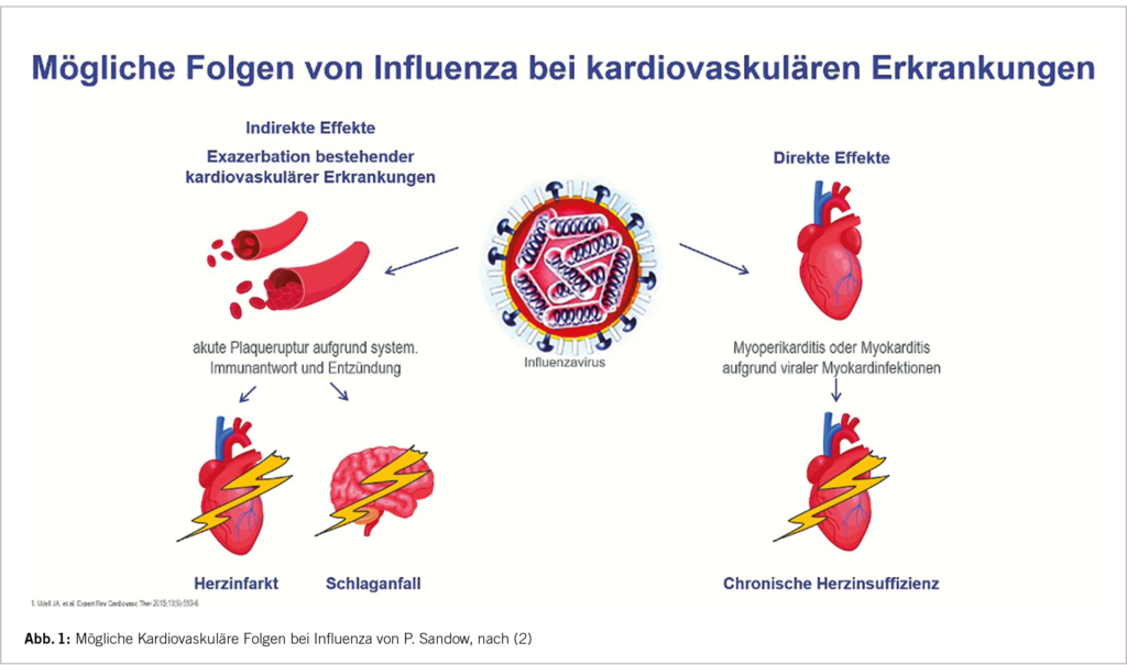 Eine Infektion mit Influenza führt durch eine Zytokin-Freisetzung zu einem systemischen Entzündungszustand. Bei Risikopatienten eventuell zu einer Hyperkoagulabilität, einer Makrophagen Aktivierung und einer möglichen septischen Konstellation mit einem hämodynamischen Ungleichgewicht mit Aktivierung des Sympathikus, einer Tachykardie und Vasokonstriktion. Diskutiert werden eine endotheliale Dysfunktion und eine Plaqueruptur. Die Folge ist ein akuter Myokardinfarkt oder Schlaganfall. Auch kann es zu einer viralen Peri-/Myokarditis mit einer möglichen Herzinsuffizienz und/oder einer Arrhythmie kommen. Die respiratorischen Komplikationen spielen eine wichtige Rolle mit Hypoxämie, Hypotonie und erhöhtem O2-Bedarf – vgl. Abb. 1 (2). An internistischen Folgeerkrankungen kommt es zu: Pneumonien, Exacerbation einer COPD oder eines Asthmas, Entgleisung eines Diabetes mellitus und weiterer Stoffwechselkrankheiten. Mögliche Verschlechterung von Nieren-, Lebererkrankungen, neurologischen, immunologischen und Krebsleiden. Dies führt zu einer erhöhten kardiovaskulären- und einer erhöhten Gesamtsterblichkeit. Das Risiko für einen akuten Infarkt ist in den ersten 3 Tagen einer Influenza bis 10-fach, das Risiko für einen Schlaganfall bis 8-fach erhöht. Die Herzinfarkt-Hospitalisation ist in den ersten sieben Tagen des Infektes 6-fach erhöht; auch ist das Risiko für eine Hospitalisation bei Patienten mit einer chronischen Herzerkrankung deutlich erhöht (2-6). Bei Erwachsenen steigt das kardiovaskuläre Risiko bei einem respiratorischen viralen Infekt, speziell bei Influenza, für einen Myokardinfarkt in der Zeit der Infekt-Episode vom ersten bis zum siebten Tag deutlich – 6-fach erhöht. Andere respiratorische Viren haben ein kleineres Risiko (5).