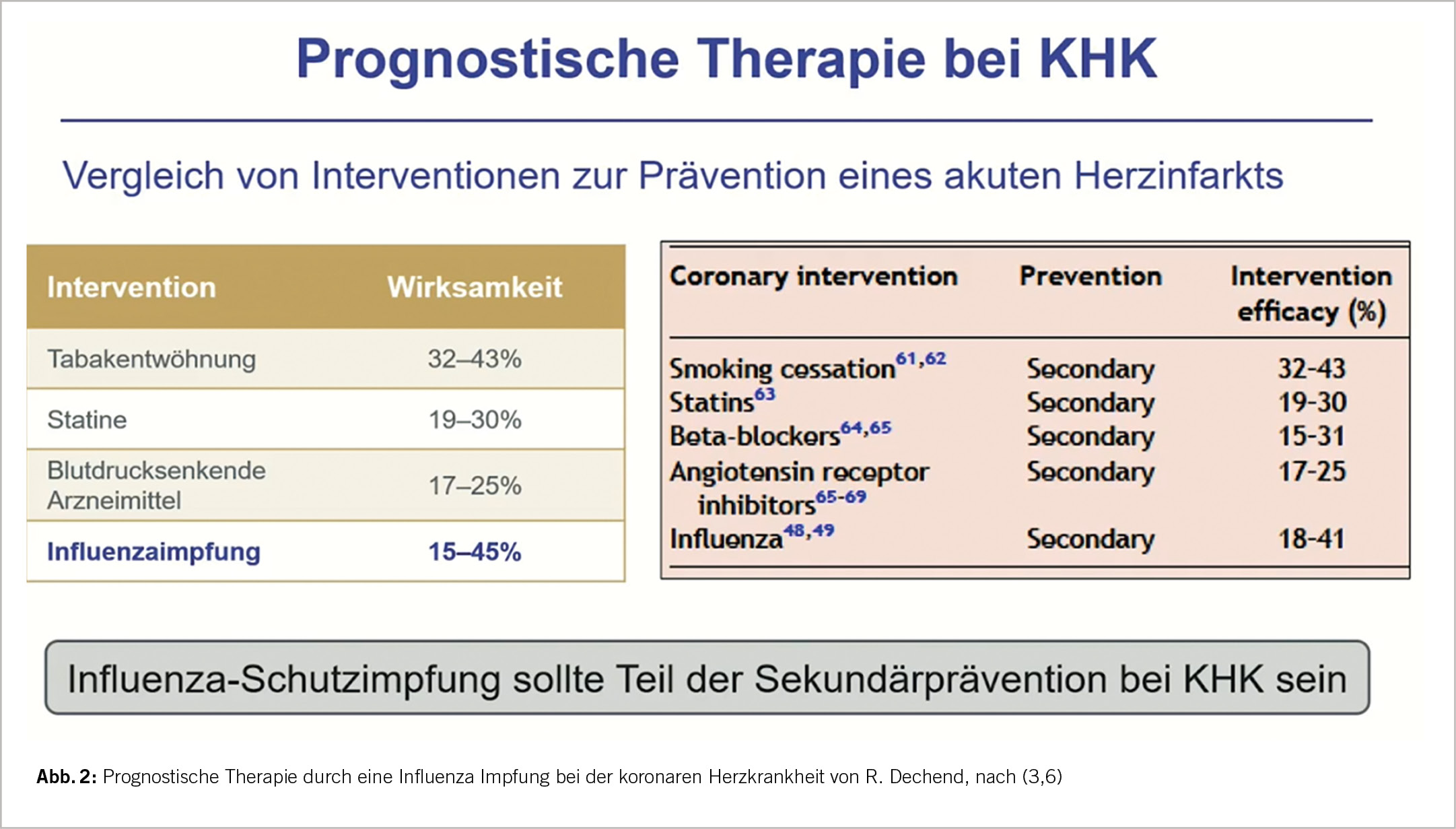 Influenza vaccination can significantly reduce cardiovascular events such as acute myocardial infarction, stroke, and all-cause and cardiovascular mortality. Prevention using an inactivated, quadrivalent HD vaccine should be performed in persons 65 years of age and older with chronic disease or in seniors ≥75 years of age each fall, according to WHO. Unfortunately, influenza vaccination coverage in chronic disease is still far too low today. Medical advice and motivation are critical in this regard. The goal would be a vaccination rate of this population ≥75%. Excess mortality from influenza is primarily cardiovascular.