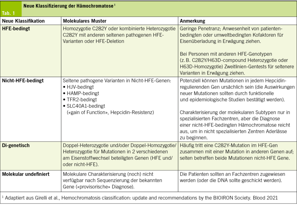 Die Heterogenität und Komplexität der genetischen Defekte, welche die Hämochromatose begünstigen, sowie die fortschreitende Erkennung dieser Defekte dank der Next-Generation-Sequencing (NGS)-Techniken, haben in den letzten Jahren zu einer neuen Klassifikation der Hämochromatose geführt. Diese Klassifikation wurde 2021 von einer Arbeitsgruppe der International Society for the Study of Iron in Biology and Medicine (BIOIRON Society) entwickelt. Diese zielt darauf ab, die genetische Komplexität besser zu berücksichtigen und die Diagnose und Behandlung von Patienten mit Eisenstoffwechselstörungen für Grundversorger zu vereinfachen und somit nicht zu verzögern. Die neue Klassifikation unterscheidet zwischen HFE-assoziierten und nicht-HFE-assoziierten Mutationen sowie di-genetischen oder nicht-molekular definierten Mutationen (Tab. 1).