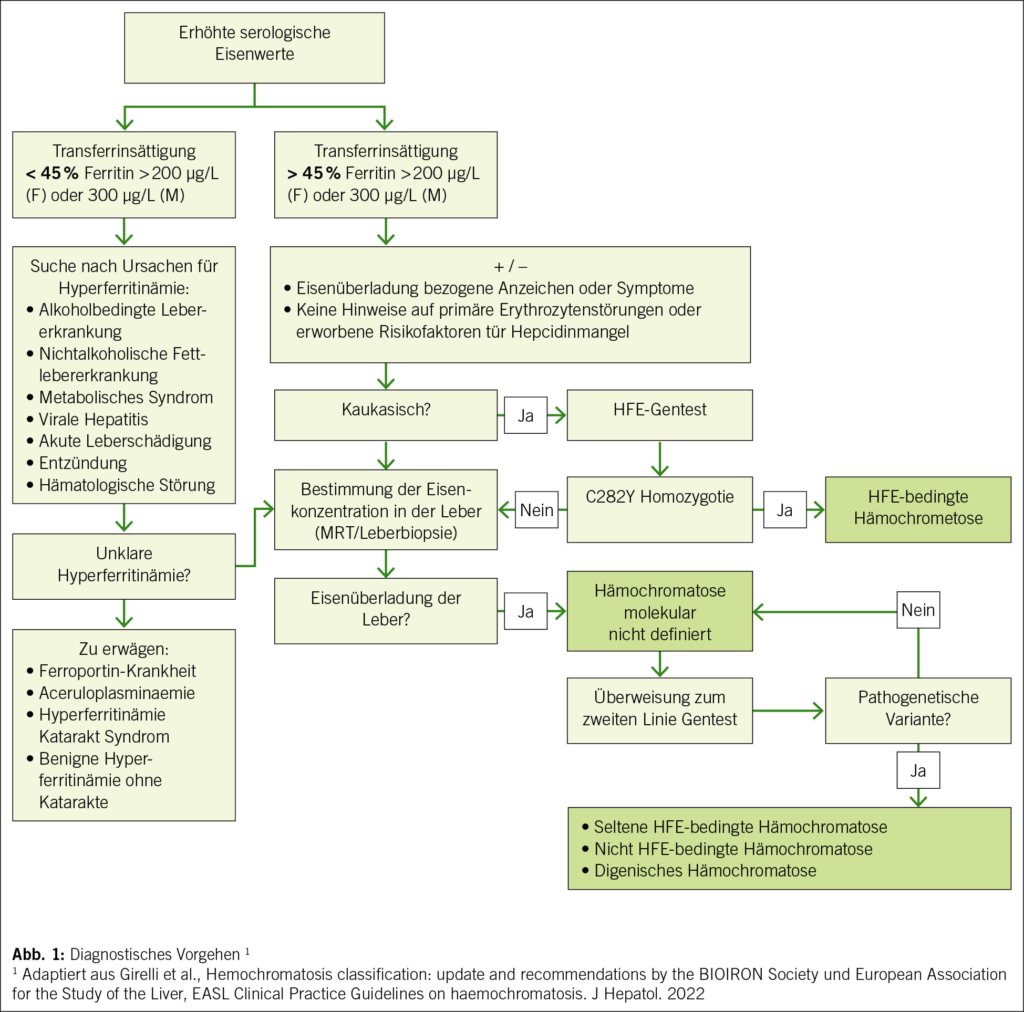 Die Eisenüberladung, Transferrinsättigung > 50 % und Ferritin > 300 µg/L bei Männern beziehungsweise > 45 % und > 200 µg/L bei Frauen, sollte primär durch die Messung der Transferrinsättigung gesucht werden, die die erste biochemische Manifestation der Erkrankung darstellt. Transferrin, ein Glykoprotein, ist für den Transport von Eisen in die extrazelluläre Umgebung verantwortlich. Der Wert der Transferrinsättigung unterliegt zirkadianen Schwankungen, daher sollte die Blutentnahme morgens erfolgen. Nüchternheit scheint die diagnostische Aussagekraft nicht zu verbessern (6). Des Weiteren ist zu beachten, dass Alkoholkonsum den Wert der Transferrinsättigung erhöhen kann (7). Ausserdem bleibt der Wert der Transferrinsättigung, selbst nach wirksamer Aderlass-Therapie, tendenziell hoch (1).