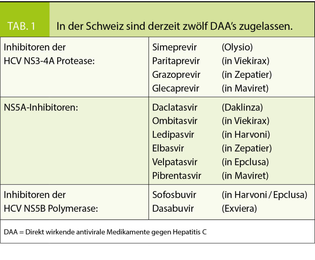 Im Gegensatz zu HIV und HBV (Therapieziel: Suppression der Virämie) kann bei der Hepatitis C die Elimination des Virus angestrebt werden. Bei negativer HCV-RNA 12 Wochen nach Ende der Therapie spricht man von SVR 12 (sustained virologic response). 99% der Patienten, die eine SVR12 erreicht haben, bleiben auch nach 5 Jahren noch geheilt, weshalb die SVR12 als Surrogatmarker für die Heilung der Hepatitis C von den Registrierungsbehörden akzeptiert wurde. Vor einer HCV Therapie muss bei den Patienten immer eine HBV- oder HIV Koinfektion ausgeschlossen werden. Ein allfälliger Alkoholabusus sowie ein metabolisches Syndrom sollten therapeutisch angegangen werden. Während der Behandlung einer Hepatitis C bei HCV/HBV koinfizierten Patienten wurde von z.T. fatalen Hepatitis B Reaktivierungen berichtet. Ein HBsAg positiver Patient muss deshalb während der Hepatitis-C-Therapie von einem erfahrenen Spezialisten mitbetreut werden, da in der Regel eine Behandlung der HBV Infektion notwendig ist. Patienten welche einzig anti-HBc positiv sind («anti-HBc-only» –Konstellation) müssen streng überwacht werden, da auch in dieser Situation HBV-Reaktivierungen möglich sind. Alle Patienten mit nicht immunem Status für HAV / HBV müssen geimpft werden (8). Aktualisierte Therapieempfehlungen findet man bei den Fachgesellschaften für Hepatologie und Infektiologie (SASL / SSI) in Form von Expertenempfehlungen (9). Eine sehr praktische Anwendung zur schnellen Abfrage von Therapieoptionen findet man als App auf www.hcvadvisor.com. Medikamentöse Interaktionen können einfach im Liverpool Interaction Checker auf www.hep-druginteractions.org abgefragt werden. Tabelle 1 enthält die im jetzigen Zeitpunkt in der Schweiz registrierten direkt wirkenden antiviralen Medikamente gegen Hepatitis C (DAA).