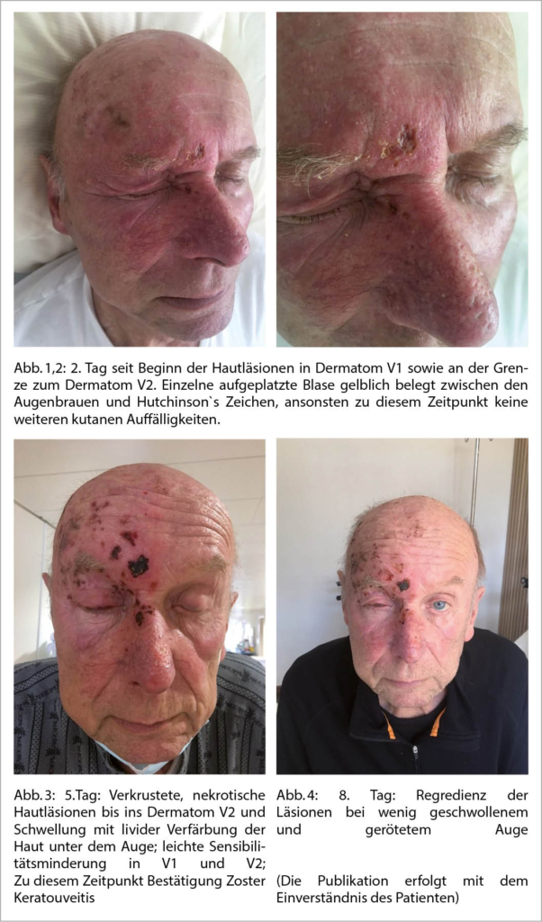 Die Leukozyten, CRP und BSR waren normwertig. Es bestanden eine leichte normochrome, normozytäre Anämie mit einem Hb von 130 g/l (Norm 120-160 g/l), sowie eine moderate Hyponatri-ämie (Natrium 128 mmol/l, Norm 135-150 mmol/l) und eine leichte Hypokaliämie (Kalium 3.4 mmol/l, Norm3.5-5.5 mmol/l). Für eine diagnostische Liquorpunktion zeigte sich der Patient zurückhaltend. Initial wurden computertomographisch eine intrakranielle Blutung sowie eine akute territoriale Ischämie ausgeschlossen. Bei hochgradigem Verdacht auf ein Tumorrezidiv oder Metastasen bei Status nach Plattenepithelkarzinom der Ohrhelix wurde ergänzend eine unauffällige Magnetresonanztomographie (MRT) des Neurokraniums durchgeführt. Der Patient wurde unter symptomatischer Therapie mit Analgetika und Opioiden stationär aufgenommen. Unter der Differentialdiagnose eines Clusterkopfschmerzes wurde Sauerstoff bei Bedarf eingesetzt. Am ersten Tag der Hospitalisation präsentierte er eine zunehmende Photophobie sowie zunehmende stechende, blitzartige Schmerzen beim Öffnen des rechten Auges, begleitet von okulärer Injektion. Erst in den folgenden Tagen der Hospitalisation traten ausgeprägte, wasserklare, vesikuläre Haut-effloreszenzen auf erythematösem Grund zwischen den Augenbraunen im Bereich der ersten Trigeminusastes V1 und an der Grenze des Trigeminusastes V2 rechts auf. Zudem waren der rechte Lidrand und die rechte Seite des Nasenrückens (Hutchinson-Zeichen positiv) betroffen und es zeigte sich eine Ptose des rechten Oberlides.