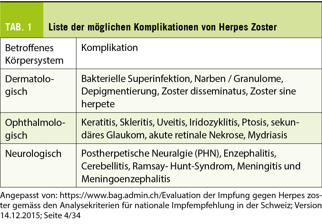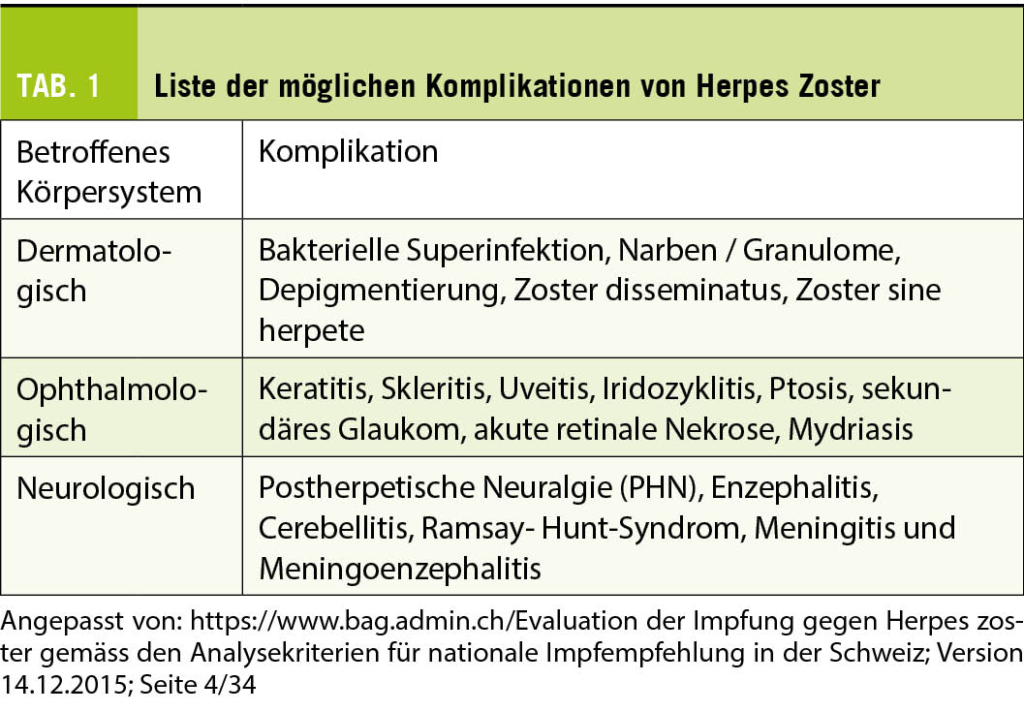 Beim vorliegenden Fall handelt es sich um eine typische klinische Manifestation des Herpes Zoster ophtalmicus. Bei der HZ-Infektion besteht keine saisonale Prävalenz. Jährlich erkranken mehr als 1.7 Millionen Menschen in Europa an HZ, wobei zwei Drittel der Erkrankten älter als 50-jährig sind (3). In der Schweiz zeigten sich im Rahmen des schweizerischen Sentinella-Meldesystems von 1998 bis 2001 ca. 17 000 Fälle pro Jahr (9). Die HZO-Fälle betragen etwa 10-20 % aller HZ-Erkrankungen. Das Lebenszeitrisiko für die Entwicklung einer HZO-Infektion beträgt ca. 1 % (5). Eine frühe Diagnose und Therapie ist wichtig, um schwerwiegende Komplikationen wie die postherpetische Neuralgie (PHN), oder auch ophthalmologische Komplikationen zu vermeiden (siehe Tabelle 1).