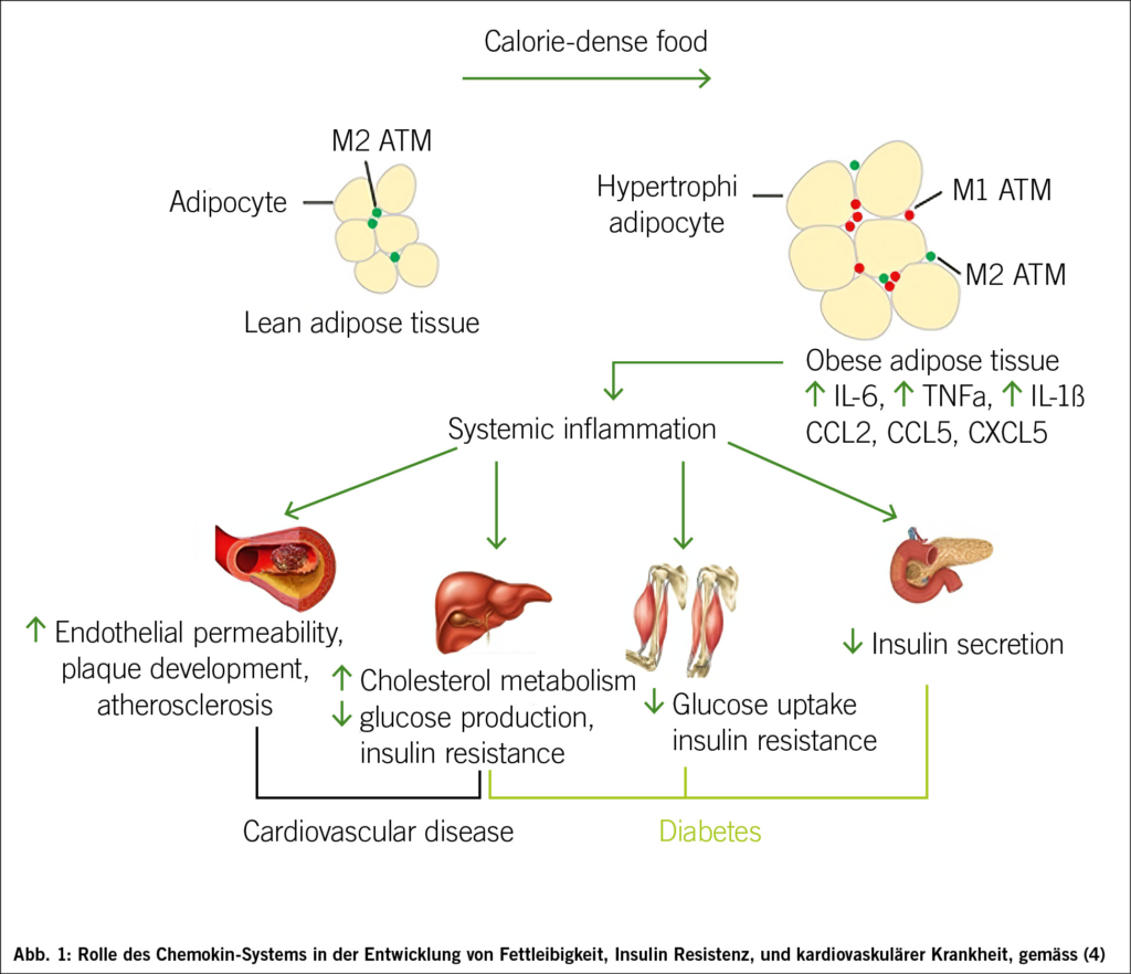 Pathophysiologisch kommt es im viszeralen Fettgewebe bei vergrösserten Adipozyten zu einer systemischen Entzündung mit Erhöhung von Interleukin 6 und IL-β und weiteren Zytokinen und TNF-α. Dies führt zu einer Endotheldysfunktion, einer Oxidation von LDL mit Dyslipidämie, Plaquebildungen und späteren kardiovaskulären Events. Zusätzlich kommt es zu einer Insulinresistenz und einer verminderten Insulinsekretion mit Diabetes mellitus Typ 2 (T2DM) (Abb. 1) (4). Gastrointestinale Karzinome sind bei Adipositas gehäuft. Erwähnenswert sind die nichtalkoholische Fettlebererkrankung und weitere internistische, neurologische, psychische und orthopädische Leiden (5). Die Adipositas wird heute als chronisch fortschreitende Erkrankung anerkannt.