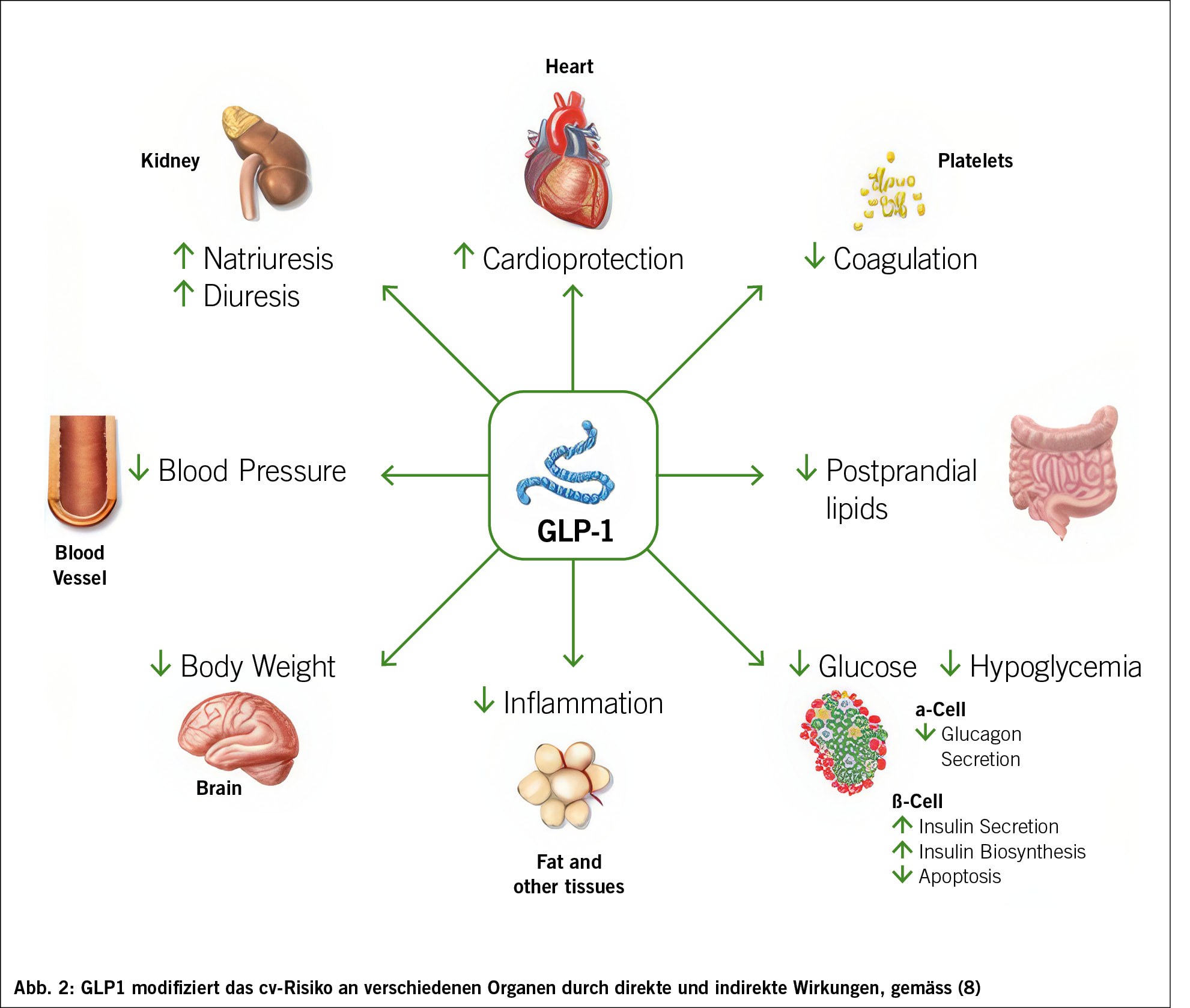 Mit den GLP1-RA haben wir heute ein Medikament, welches als Antidiabetika ebenfalls zu einer signifikanten Gewichtsreduktion führt. GLP1-RA ahmen die Wirkung der körpereigenen Hormone GLP-1 und glukoseabhängiges insulinotropes Peptid (GIP) nach; diese werden bei T2DM vermindert ausgeschüttet, wodurch der Inkretin-Effekt, d.h. die blutzuckersenkende Wirkung, verringert ist (Abb. 2) (7, 8).