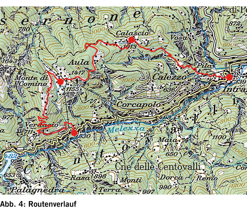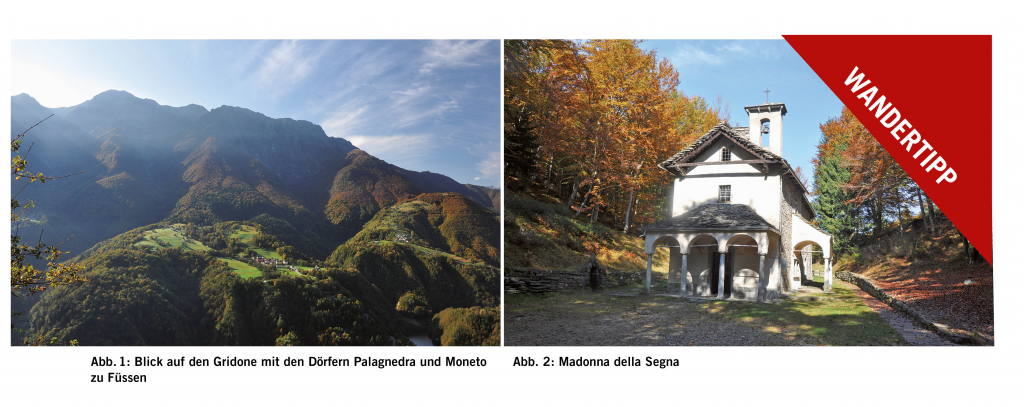 Wir steigen vom Bahnhof zur Kantonsstrasse hinauf und stossen kurz vor der Brücke über den Ri della Segna bergseitig auf den alten Zugangsweg nach Verdasio. Jenseits des Baches liegt die Talstation der besagten Bahn zum Monte di Comino hinauf. Unser Pfad führt uns am Westrand des Weilers Verguno vorbei und quert nordwestlich der Talstrasse den besagten Bach. Wir gelangen zur Fahrstrasse nach Verdasio und folgen dieser bis zum Dorfeingang. Dort zweigt der breite und grossteils befestigte Saumweg zu den weit verstreuten Häusergruppen des Monte di Comino ab. Über weite Kehren im Wald gewinnt er allmählich an Höhe und bietet immer wieder herrliche Ausblicke in das viel gegliederte Tal mit seinen Dörfern, Maiensässen und Alpen (Abb. 1). Prächtig ist das Farbenspiel der herbstlichen Wälder. Zwei Wegkapellen säumen den Weg bis zur Wallfahrtskapelle von Madonna della Segna (Abb. 2), wobei nur in der oberen der Beiden noch Teile von Fresken erhalten geblieben sind. Auf Monte di Comino halten wir kurze Rast im Ecohotel Alla Capanna, das auch die Möglichkeit zur Übernachtung bietet.