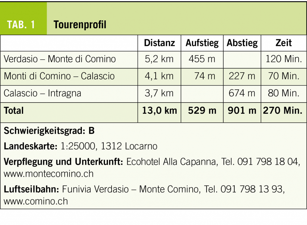 Diese Wanderung bietet prächtige Ausblicke in die Ebene des Pedemonte, die Centovalli und darüber hinaus in die italienische Valle Vigezzo. Wir fahren mit dem Bummelzug von Intragna zur Stazione Verdasio. Man beachte, dass der mit Domodossola angeschriebene Zug nicht an allen Stationen hält, so auch nicht in Verdasio! Natürlich lockt die Luftseilbahn zum Monte di Comino hinauf. Wer diese Variante wählt, erspart sich zwar zwei Stunden Aufstieg, verpasst dafür aber einen herrlichen Saumweg.
