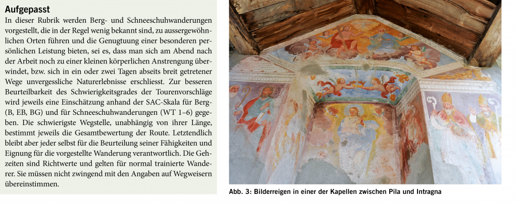 Auf befestigtem Weg steigen wir über Ursöld zu den unteren Häusern von Cremaso ab. Hinunter nach Pila kommen wir an einer ersten grösseren Kapelle mit Vordach vorbei, die der Madonna di Re geweiht ist. In Pila selbst und nach Intragna hinunter treffen wir noch auf mehrere Bildstöcke in dieser Bauart (Abb. 3). Ihre Häufigkeit weist auf die auch religiöse Bedeutung des von uns begangenen Weges hin, der früher vermutlich für Prozessionen und Bittgänge rege benutzt wurde. Das Vordach, im Dialekt Sprügh genannt, bot Schutz vor Unbill der Witterung, sollte aber natürlich auch zum Gebet und zur inneren Einkehr einladen.