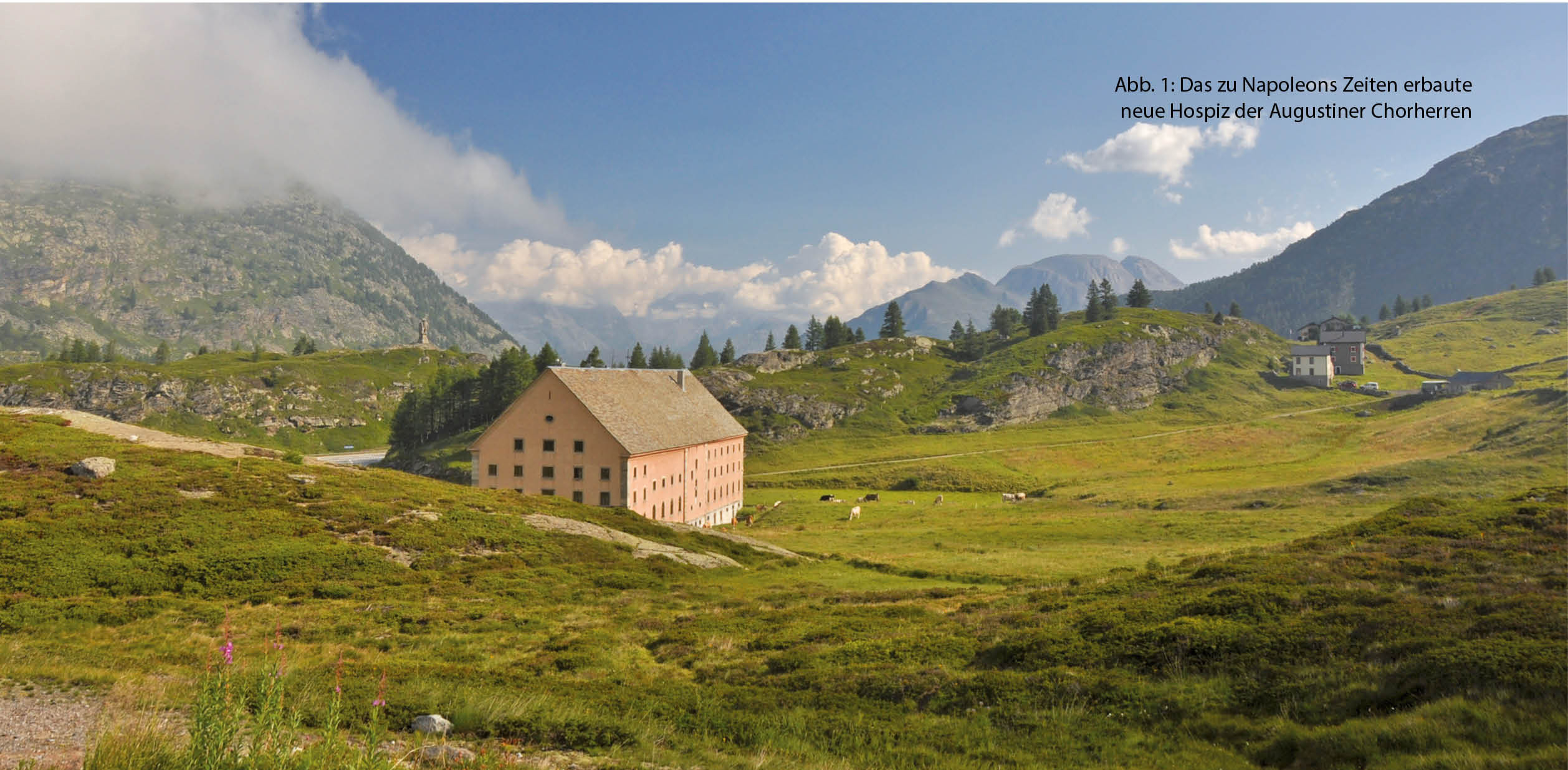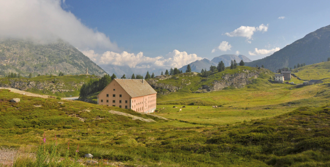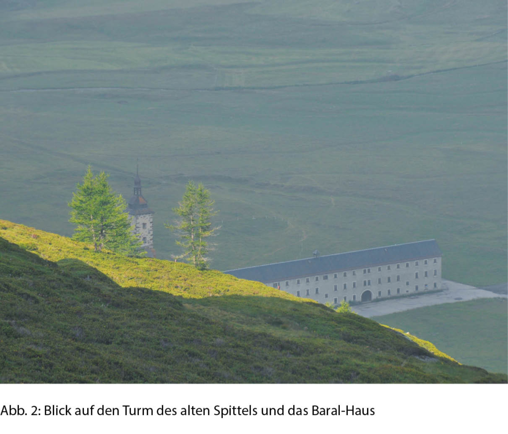 Bei der südlichen Schmalseite des mächtigen Hospizes, das noch heute von Augustiner Chorherren betrieben wird, beginnt der Höhenweg und führt vorerst zum Rotelsee hinauf (Abb. 1). Zwischen den sich bereits gegen Norden jagenden Nebelschwaden erhaschen wir ab und zu einen Blick auf den Chaltwassergletscher am Fuss des Monte Leone, der sich uns nicht zeigen mag. Über wenige Kehren und eine lange Traverse gegen Süden erreichen wir ein kleines Plateau auf dem Südwestgrat des Hübschhorns. Von hier aus könnten wir die Aussicht auf des Fletschhorn und das südliche Passgebiet geniessen, wenn Wolken und Nebel es zulassen würden. Lediglich einen kurzen Blick auf das im Tal liegende Alte Spittel können wir erhaschen (Abb. 2).