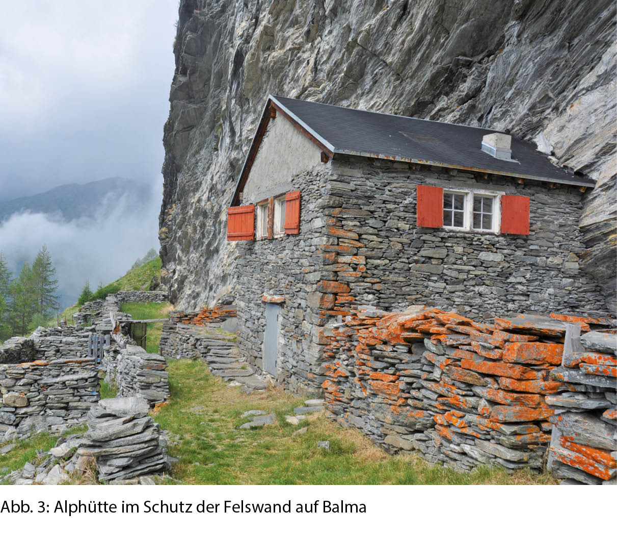 Ein kurzer Abstieg führt uns zur nächsten Hangtraverse gegen Südosten durch den Lawinenhang von Howeng. Die im Talboden entlangführende Passstrasse musste entsprechend durch eine lange Galerie geschützt werden. Schliesslich lenkt der Pfad in den kleinen Talkessel am Fuss des Breithorns ein, wo die Alp Balma liegt. Der Name weist auf die Lage der Alphütte unter einer mächtigen Felswand hin. Um die Hütte sind mit hohen Steinmauern Pferche für das Vieh abgetrennt (Abb. 3). Auf dem am Walibach gelegenen Brunnen können wir einer Inschrift entnehmen, dass diese Alp bereits seit mehr als 600 Jahren bestossen wird. Auf einer weit abgesteckten Weide grast wie zum Beweis eine grosse Herde von Walliser Schwarznasenschafen.