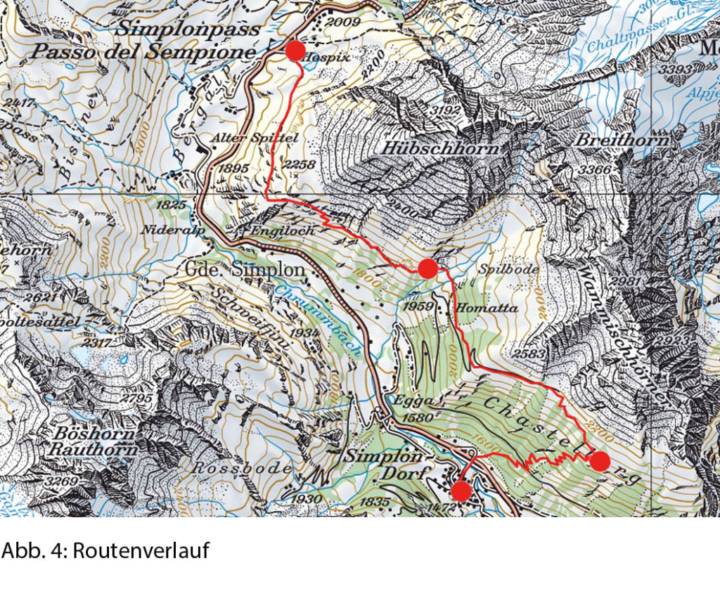 Nun gilt es, einen zweiten kurzen Anstieg zu bewältigen. Er führt oberhalb der Hütten von Homatta vorbei zum Fuss der Chesselchumma zwischen Glatthorn und Chellihorn hinauf. Auffallend ist die Bauweise der Häuser auf der Südseite des Passes, so auch des Stalles auf Galbode, die bereits derjenigen des Tessins und der lombardischen Alpentäler entspricht. Überhaupt kommt es mir vor, als würde ich bereits meine Tessiner Heimat riechen. Der Weg hinauf durch den lichten Lärchenwald ist wunderschön, obwohl man sich den letzten asphaltierten Wegabschnitt bis zum mächtigen Lawinenschutzwall am Ende der Chesselchumma am liebsten wegdenken würde. In leichtem Abstieg erreichen wir die Ruinen des Hobielestafel, wo unser Abstieg nach Simplon-Dorf beginnt. In zahlreichen Kehren auf dem gut ausgebauten Alpweg erreichen wir durch den Wald von Chastelberg die Zufahrtsstrasse vom Dorf zur Nationalstrasse (Abb. 4). Der Weg nach Gondo bleibt uns für heute verwehrt, getreu dem Wetterbericht ballen sich bereits die Gewitterwolken über der Gondoschlucht.