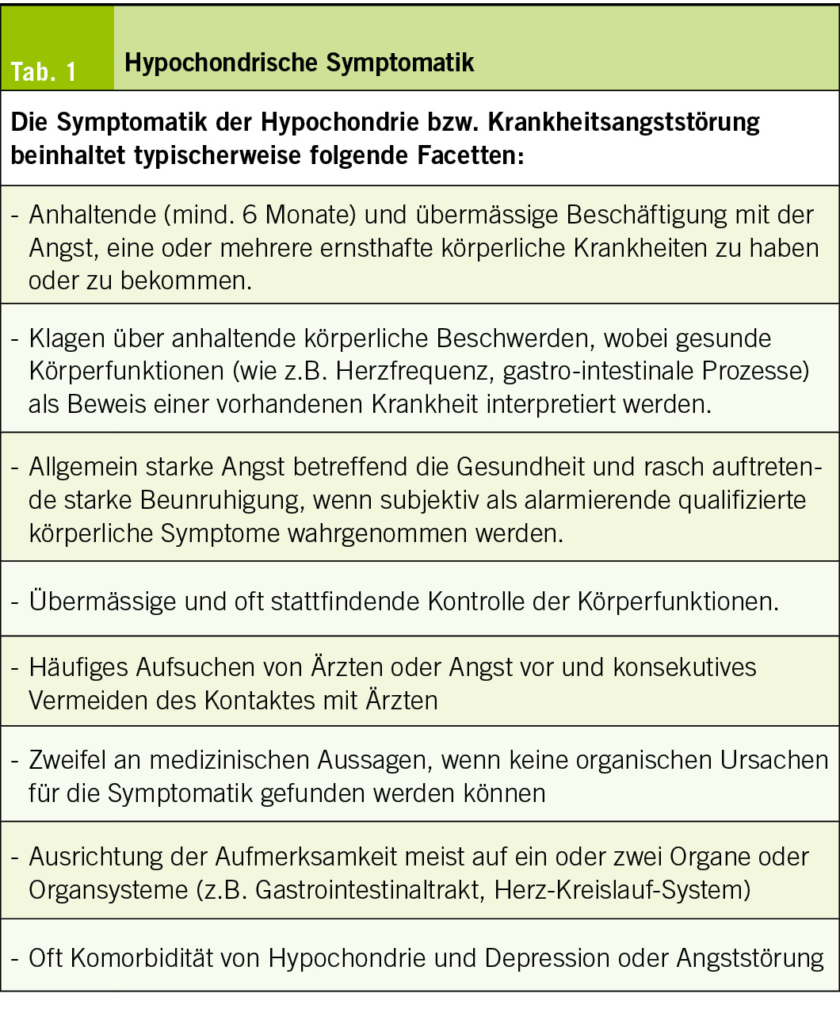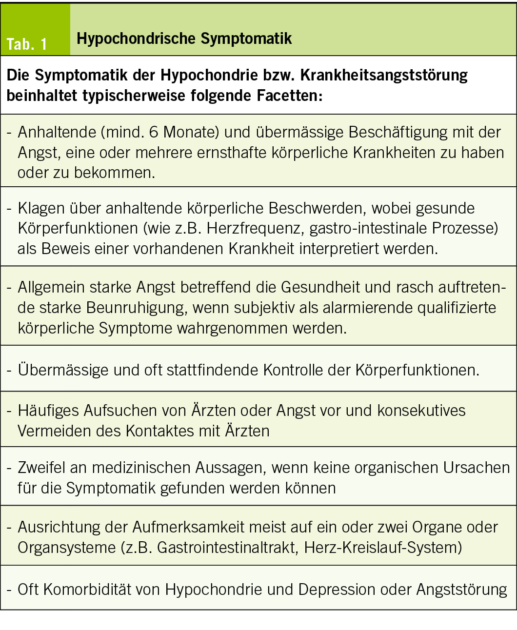 Die Krankheitsangst ist gekennzeichnet durch Ängste bzw. der angstvollen Überzeugung, an einer oder mehreren schweren und fortschreitenden körperlichen Erkrankungen zu leiden oder diese zu bekommen. Die Ängste und die unablässige Beschäftigung mit dem eignen Körper als Kernsymptome entstehen durch eine Fehlinterpretation von körperlichen Funktionen und Empfindungen und belasten die Patienten massiv (Tab. 1). Die Überbewertung von körperlichen Symptomen und die zunehmende drängende Angst davor, an einer schweren Erkrankung zu leiden, führen Patienten in die Ärztepraxen, wo sie oft Dauergäste werden und meist verzweifelt die Rückversicherung und Gewissheit darüber suchen, dass sie doch nicht durch ihren Körper bedroht sind. Gewisse Autoren wollten die Hypochondrie deshalb auch mehr den Angst- oder den Zwangsstörungen denn den somatoformen Störungen zugeordnet wissen, da die Krankheitsangst eben vorherrschend ist und die Beschäftigung mit der Kontrolle des Körpers und dessen Funktionen zwanghaften Charakter annehmen kann. Die Beobachtung des Körpers im Sinne einer erhöhten Aufmerksamkeitszuwendung mit nachfolgend katastrophisierender Interpretation endet im Teufelskreis. Das Checking Behavior, also das andauernde Suchen nach und die Kontrolle von verdächtigen Symptomen z.B. ständiges Abtasten, Abhören, Messen des Blutdrucks etc., führt zunehmend zur Verunsicherung und chronischen Belastung in der Beziehung zum eigenen Körper. Funktionelle Körperbeschwerden sind zuweilen auch selbstlimitierend, doch bei allen Somatisierungsstörungen besteht durch den Grundcharakter der Erkrankung eine Tendenz zur Chronifizierung. Die Übergänge zwischen den einzelnen Somatisierungsstörungen sind darüber hinaus fliessend, was das diagnostische Handeln erschweren kann.
