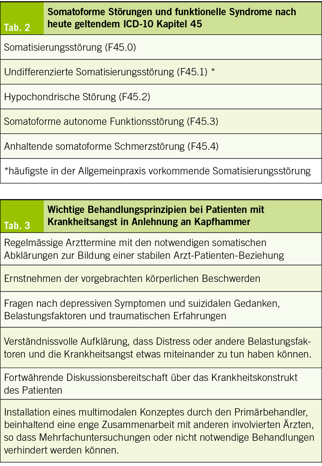 Die Grundversorgung von Patienten mit Krankheitsangst erfolgt durch den Hausarzt oder den somatischen Facharzt. Dabei hilfreich ist die «Sowohl-als-auch-Perspektive», die somatische und psychosoziale Krankheitsaspekte berücksichtigt. Die sorgfältige Befragung sowie das aufmerksame Zuhören und Nachfragen auch während der körperlichen Untersuchung festigen die Arzt-Patienten-Beziehung. Diagnostische Wachsamkeit (Visionsfähigkeit) bei gleichzeitig diagnostischer Zurückhaltung sowie Empathie führen zu einer grösseren Behandlungszufriedenheit und damit zu einem günstigeren Verlauf und einer verbesserten Prognose. Der Ausschluss von somatischen Ursachen erfolgt über die körperliche Untersuchung (EKG, Routinelabor inkl. Schilddrüsenhormonbestimmung), oft sind jedoch weitere fachärztliche Abklärungen notwendig und sinnvoll, die eine zumindest intermittierende Beruhigung des Patienten bewirken können. Patienten mit Krankheitsangst durchlaufen lange Krankheitsphasen, damit verbunden ist meist eine lange Behandlungsodyssee. Sie finden nicht einfach durch gutgemeinte medizinische Ratschläge in die Gesundheit zurück. Hypochondrische Patienten sind auch keine Simulanten, doch erleben sie sich oft als solche bewertet. Aussagen wie «Sie haben nichts», «Sie sind kerngesund» oder «Schauen Sie einfach nicht mehr im Internet nach» können bei ihnen nicht zum Behandlungsziel führen, sondern nur im Vertrauensverlust gegenüber dem Arzt enden.