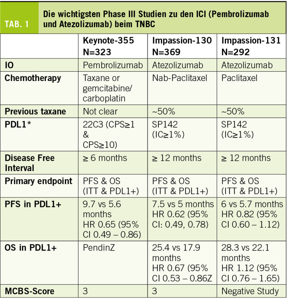 Zwischenzeitlich kommen die ICI auch zunehmend zum Einsatz in der neoadjuvanten Therapie des TNBC und stehen auch in der Schweiz kurz vor der Zulassung, wobei die Resultate der Studien z.T. unterschiedlich sind.