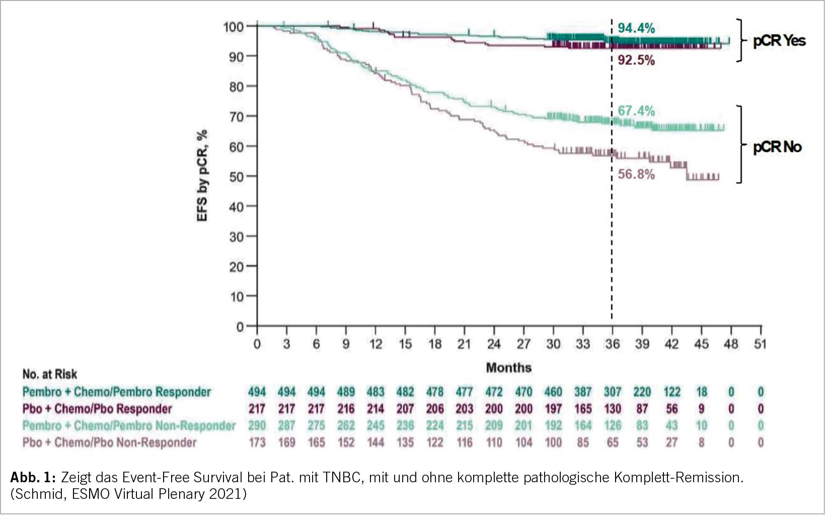 In der KEYNOTE 522 Studie wurden Patientinnen mit einem TNBC im Stadium II und III (T1c, N1-2 oder T2-4, N0-2) randomisiert und neo-adjuvant mit 4 Zyklen Carboplatin AUC 5 in Kombination mit wöchentlich Taxol gefolgt von 4 Zyklen Doxorubicin/Epirubicin in Kombination mit Cyclophosphamid behandelt +/- der Immuntherapie Pembrolizumab (9). Postoperativ wurde Pembrolizumab/Placebo für weitere 9 Zyklen fortgeführt. Dabei zeigte sich nach 39.1 Monaten Follow-up ein signifikant besseres Event-free-survival (EFS) von 84.5% gegenüber 76.8% mit der zusätzlichen Immun-Checkpoint-Blockade sowie eine Reduktion des Risikos für Tod um 37% (HR = 0.63). Die OS-Daten sind aktuell noch nicht reif. Bezüglich der pathologischen Komplettremission (pCR) zeigte sich ein Nutzen von 13.6% (51.2% versus 64.8%) unabhängig vom PD-L1 Status. Dass die pCR sich in das Gesamtüberleben übertragen lässt, wissen wir bereits aus früheren Studien. (10). In der KEYNOTE 522 Studie ist nun auch sehr schön zu sehen, dass die pathologische Komplettremission sowohl in der Patientengruppe mit ICI als auch in der Placebo-Gruppe, mit einem deutlich besseren EFS nach 3 Jahren assoziiert ist (Abb. 1).