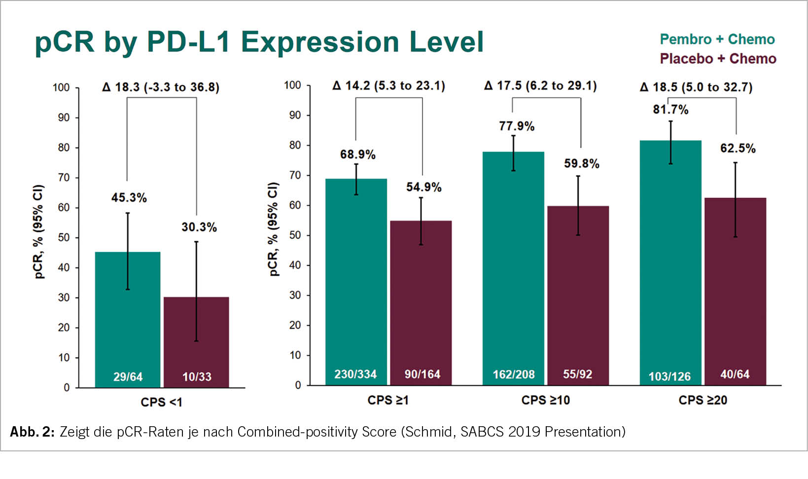 Die pCR bei der PD-L1 positiven Subgruppe war mit der zusätzlichen ICI mit 68.9% höher als mit Placebo 54.9%. Aber auch in der PD-L1 negativen Gruppe war ein Anstieg der pCR-Rate von 30.3% auf 45.3% zu sehen. Somit ist der Nutzen der ICI unabhängig vom PD-L1 Status. Es zeigt sich hier zudem, dass der PD-L1 Status prognostisch ist für den Outcome beim TNBC (Abb. 2).
