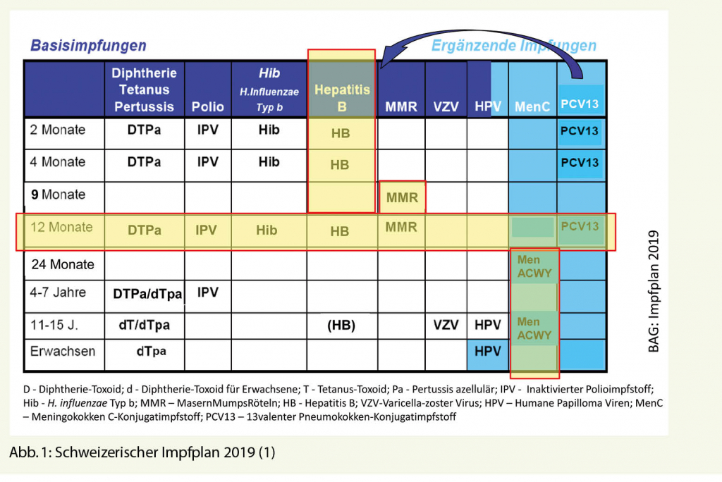 - Im Schweizerischen Impfplan 2019 wird eine Grundimmunisierung für Diphtherie, Tetanus, Pertussis, Polio, H. influenzae Typ B, Hepatitis B, Masern, Mumps, Röteln Varizellen und HPV empfohlen