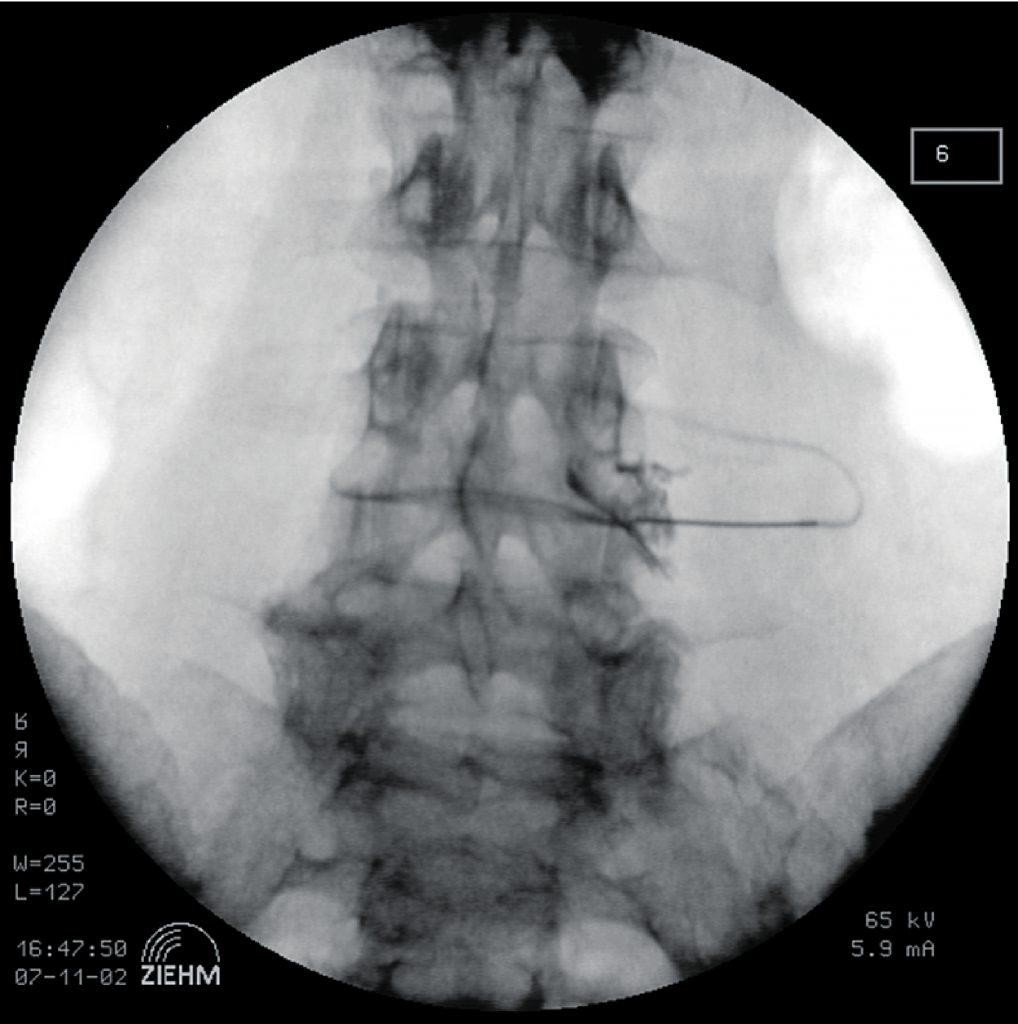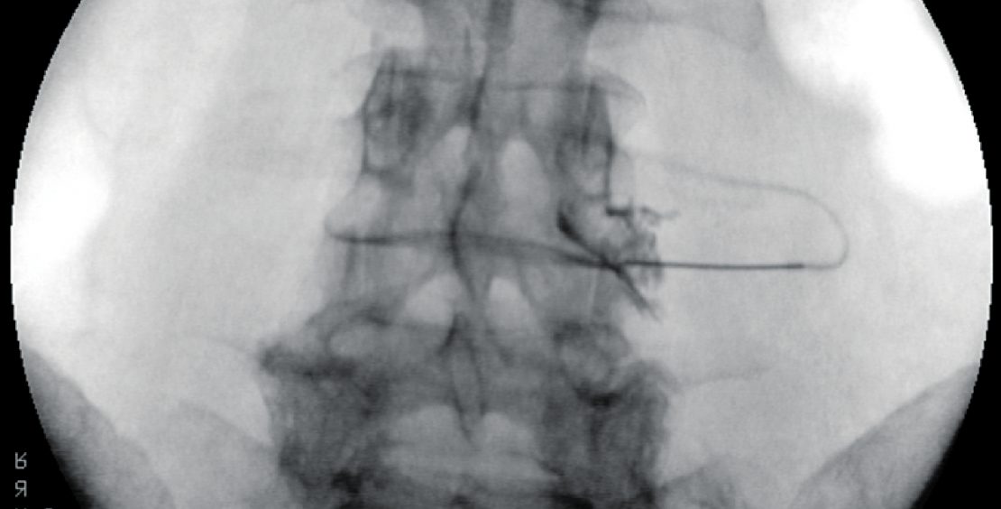 Zur Diagnostik werden aufgrund der hohen Rate falsch-positiver Ergebnisse bei der ersten Intervention zwei Interventionen zu unterschiedlichen Zeitpunkten, sinnvollerweise mit unterschiedlich lang wirkenden Lokalanästhetika (zum Beispiel Lidocain und Bupivacain) durchgeführt (11). Vor Injektion des Lokalanästhetikums wird zur definitiven Lagekontrolle sowie zum Ausschluss einer intravasalen Position der Nadelspitze Röntgenkontrastmittel injiziert (Abb. 1). Nach positiver Diagnostik kann unter therapeutischem Aspekt sowohl die perkutane funktionelle Denervation (Radiofrequenztherapie) als auch die transforaminale Steroidinfiltration zum Einsatz kommen, wobei die Durchführung grundsätzlich der Durchführung der diagnostischen Blockaden sehr ähnlich ist. Für die Wirksamkeit der Radiofrequenztherapie besteht etwas Evidenz (12), die Evidenz bezüglich Steroidinfiltrationen ist nicht eindeutig belegt (13).