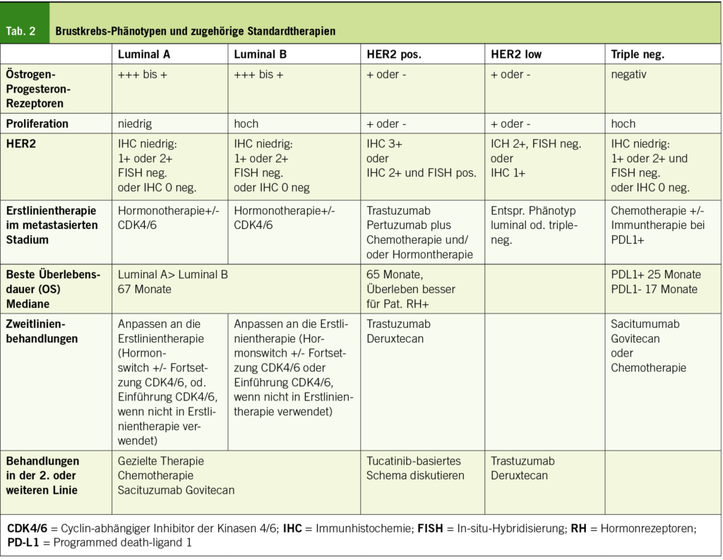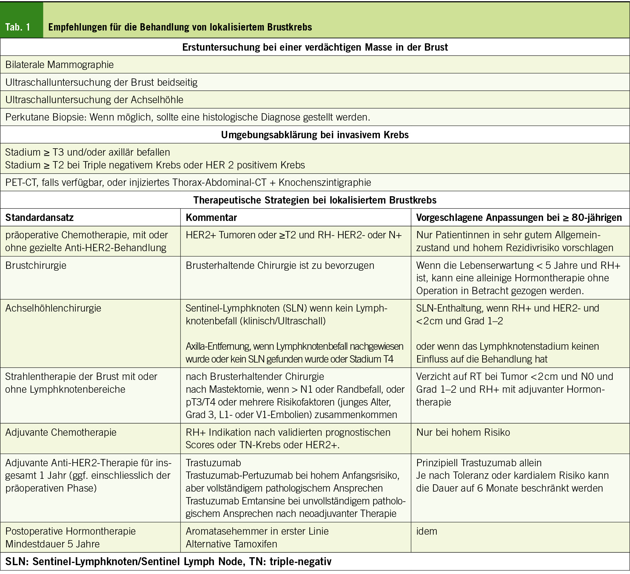 Wenn die Lebenserwartung <10 Jahre beträgt, ist das Mammographie-Screening sinnlos, da eine Reduzierung der Brustkrebssterblichkeit unwahrscheinlich ist (7). Die Standardbehandlung ist in der Tabelle 1 zusammengefasst. Die Wahl der Therapie hängt in erster Linie von der TNM-Klassifikation und dem histologischen Phänotyp ab (Tabelle 2). Etwa 90 % der Patientinnen im Alter von ≥80 Jahren weisen RH+ HER2– Tumoren auf (8).