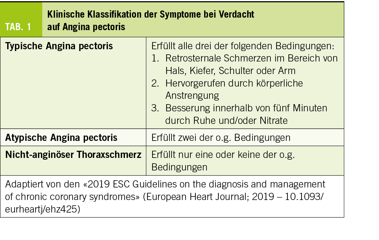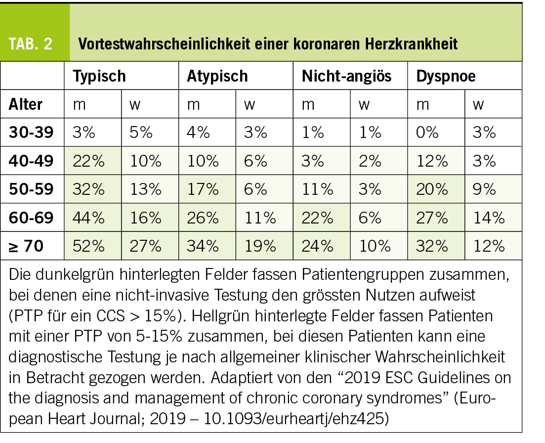 Aktuell empfehlen die ESC Guidelines einen stufenweisen Ansatz zur Diagnostik des CCS (4). Nach einer Basisevaluation, die eine Klassifizierung der Thoraxschmerzen (Tab. 1) einschliesst, wird die Vortestwahrscheinlichkeit (‘pre-test probability’, PTP) beurteilt. Bei einer mittleren PTP (15-85%) sind nicht-invasive diagnostische Tests am sinnvollsten. In den aktuellen Guidelines von 2019 wurde die Vortestwahrscheinlichkeit nach neueren Daten (5) nach unten korrigiert und Dyspnoe als Angina-äquivalent aufgenommen (Tab. 2) (4). Patienten mit einer PTP < 15% haben eine gute Prognose, sodass auf eine weitere routinemässige Diagnostik verzichtet werden kann (5). Liegen Faktoren vor, die die klinische Wahrscheinlichkeit für eine KHK erhöhen, wie EKG-Veränderungen oder kardiovaskuläre Risikofaktoren, kann auch bei Patienten mit tiefer PTP eine nicht-invasive Abklärung in Betracht gezogen werden.
