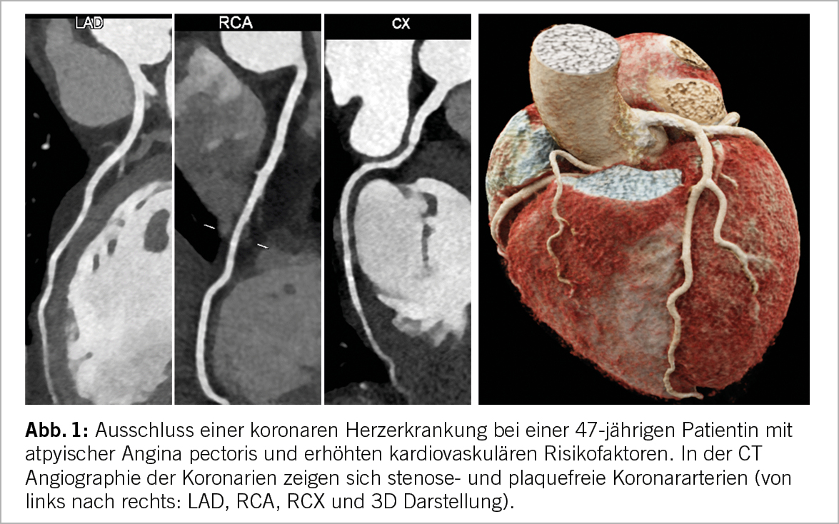Die CT-Angiographie erlaubt mit der Gabe eines iodhaltigen Kontrastmittels die Darstellung der Koronaranatomie sowie möglicher Plaques (inkl. Charakterisierung der Plaques) und Stenosen (Abb. 1). Sie bietet eine hohe Genauigkeit für die Diagnostik und insbesondere den Ausschluss des CCS (11) und diagnostiziert im Gegensatz zu funktioneller Bildgebung auch subklinische arteriosklerotische Veränderungen der Gefässe. Da Stenosen mit einer Lumeneinengung von 50-90% nicht immer zu myokardialer Ischämie führen, wird eine nicht-invasive oder invasive funktionelle Beurteilung dieser empfohlen (4). Die CTA eignet sich bei Patienten ohne bekanntes CCS und einer PTP im unteren bis intermediären Bereich. Auch zur Abklärung der Durchgängigkeit von aortokoronaren Bypässen kann die CTA hilfreich sein (4, 12). Bei ausgedehnten Koronarverkalkungen besteht das Risiko, dass Stenosen überschätzt werden. Eine negative CTA hat einen hohen negativen prädiktiven Wert, die langfristige Prognose dieser Patienten ist exzellent (13).