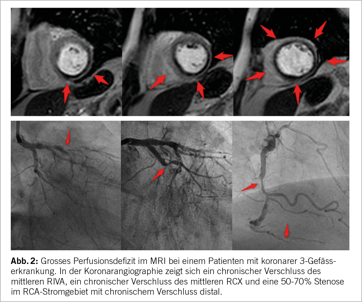 Mit dem Herz MRI können myokardiale Perfusionsdefizite (Abb. 2) unter pharmakologischer Belastung, meist nach Gabe des Vasodilatators Adenosin oder Regadenoson oder seltener unter direkter pharmakologischer Belastung mit Dobutamin (17), untersucht werden. Im Vergleich zur invasiven Koronarangiographie zeigt das Herz MRI für die Diagnose einer signifikant obstruierenden KHK eine hohe Sensitivität und Spezifität (18, 19) (Tab. 3). Das MRI liefert hierbei bessere prognostische Information als klinische Daten oder die Beurteilung der Wandbewegung. Patienten mit myokardialer Ischämie im Herz MRI haben ein höheres Risiko für kardiovaskuläre Ereignisse, wohingegen eine normale Perfusionsuntersuchung Patienten mit tiefem Risiko identifiziert (20). Technische Weiterentwicklungen mit Perfusionsquantifzierung und 3D-Perfusionsuntersuchungen, sowie frei geatmete Sequenzen werden die diagnostische Genauigkeit und Patientencomfort zukünftig weiter verbessern (19, 21, 22).
