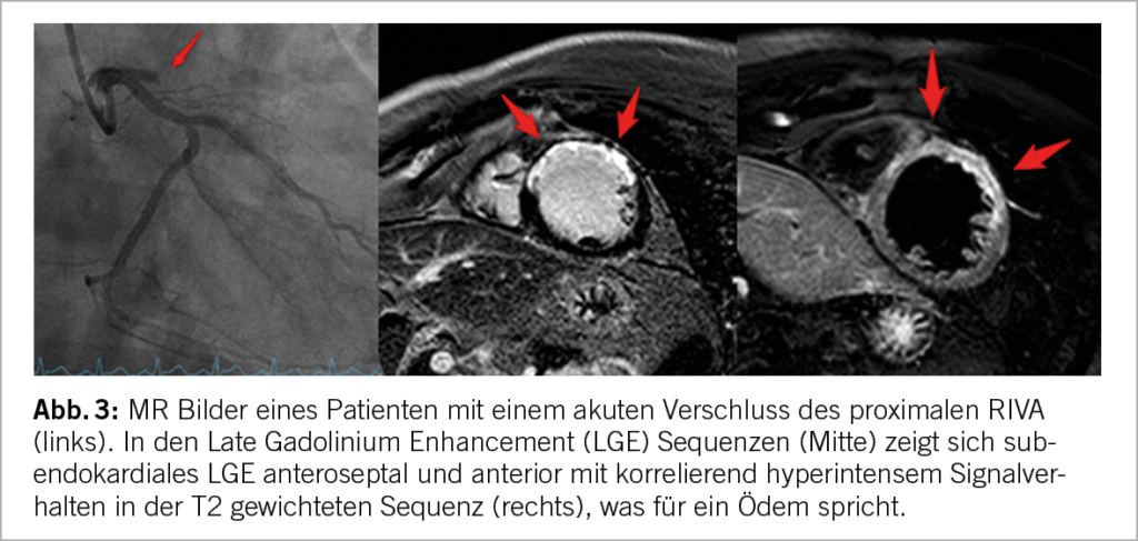 Unter den funktionellen Tests bietet das Herz MRI – neben der fehlenden Strahlenbelastung – einzigartige Vorteile. So können neben der myokardialen Perfusion auch die biventrikuläre Funktion, Klappenerkrankungen und Narben (Abb. 3) (23) in einer Untersuchung beurteilt werden. Das Herz MRI ist der Goldstandard für die volumetrische und funktionelle Beurteilung der Ventrikel. Weiterhin ist eine myokardiale Gewebecharakterisierung möglich und die akute myokardiale Schädigung (mit Ödem) (Abb. 3) kann von chronischen oder älteren Prozessen unterschieden werden.
