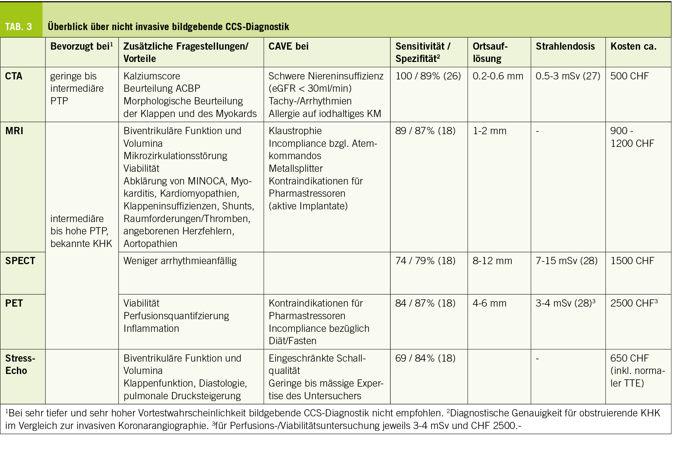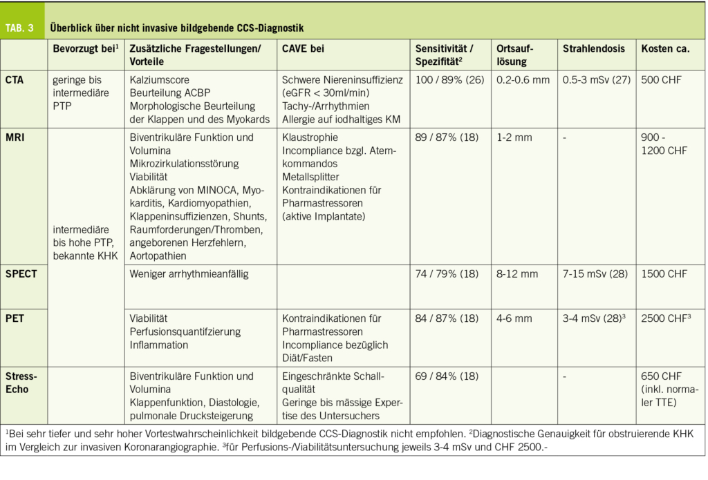 Zusammenfassend bietet jede Untersuchungsart Vorteile und Limitationen. Je nach klinischem Bild, Vortestwahrscheinlichkeit sowie lokaler Verfügbarkeit und Expertise muss die geeignete Diagnostik individuell gewählt werden. Es ist zu erwarten, dass technische Weiterentwicklungen zukünftig zu einem noch grösseren Stellenwert der nicht invasiven CCS-Diagnostik führen werden.