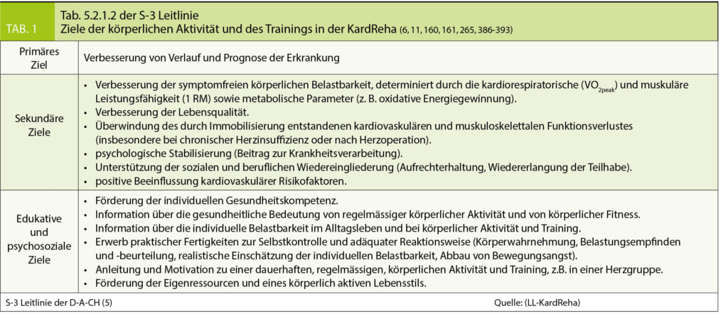 Schon Studien aus den 1950er Jahren zeigten den Zusammenhang zwischen körperlicher Aktivität und Mortalität in Bezug auf Herz-Kreislauf-Erkrankungen (CVD) (3). Aufgrund unzähliger, zwischenzeitlich durchgeführter Studien besteht derzeit weitgehend Einigkeit darüber, dass körperliche Aktivität unabhängig vom Alter der Gesundheit zugutekommt. Seit diesem Jahr liegt auch ein umfassendes und sehr schönes Positionspapier der Europäischen Gesellschaft für Preventive Cardiology (EAPC) zur Kardialen Rehabilitation vor (4). Die Ziele der Rehabilitation sind in der Tabelle 1 aufgezeigt, welche der Tab. 5.2.1.2 aus den ebenfalls in diesem Jahr erschienenen S-3 Leitlinie der D-A-CH übernommen wurde (5). Die Prognose und der Verlauf der Erkrankung soll nachhaltig verbessert werden, wobei dies stark mit der kardiopulmonalen und kardiovaskulären Fitness vergesellschaftet ist. Insbesondere die symptomfreie Belastbarkeit beeinflusst die Lebensqualität im Alltag und ist wichtig für eine rasche Wiedereingliederung im Beruf und ermöglicht ebenso die Wiedererlangung der sozialen Teilhabe (5, 6).