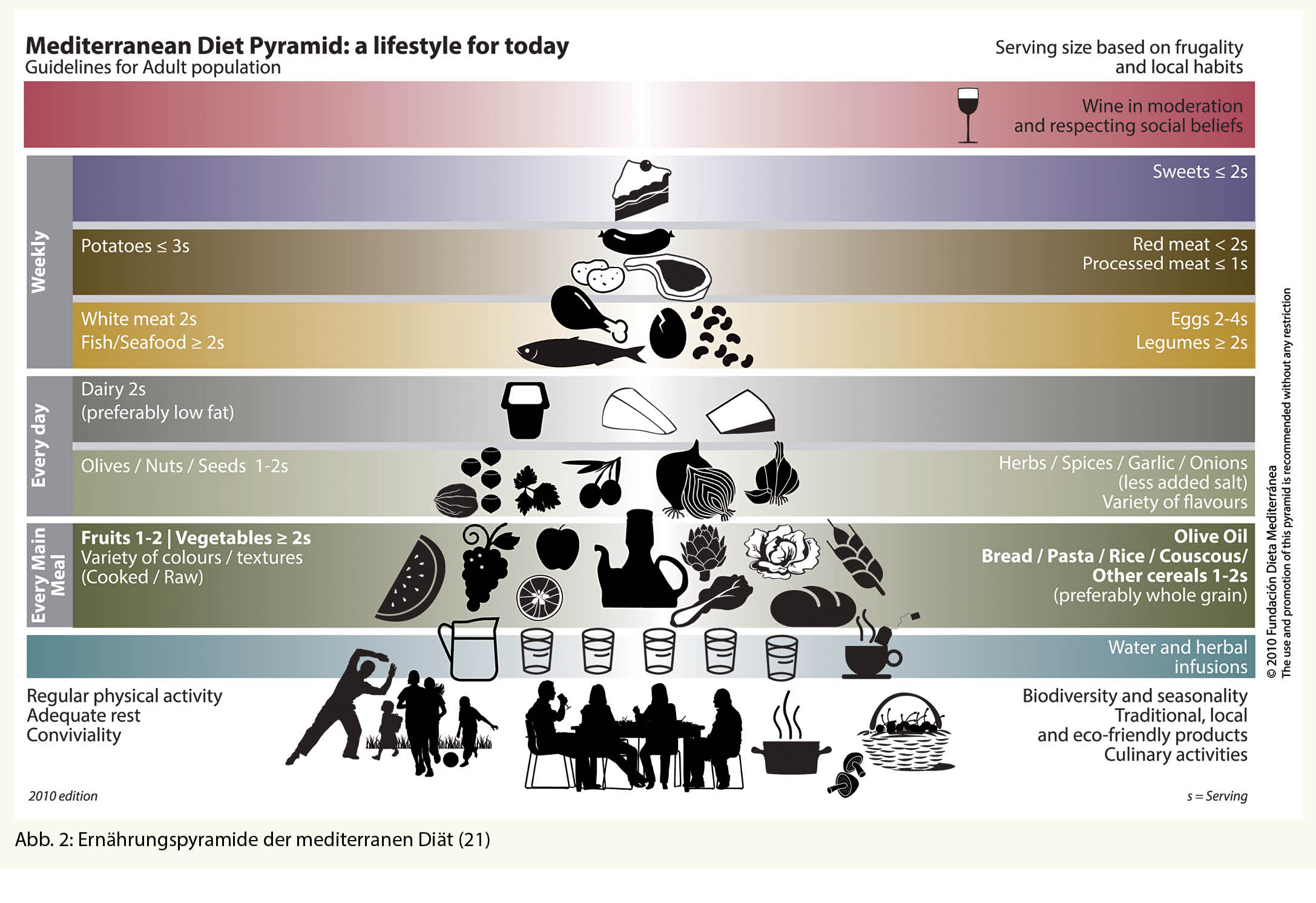 Die mediterrane Diät würde aber zu kurz greifen, wenn man deren positive Eigenschaften einfach auf die Nahrungsmittel beschränken würde. Denn Diät kommt eigentlich vom griechischen Wort δίαιτα. Dies bedeutet «Lebensstil» und darin sind weitere Dinge enthalten wie die Kultur, das soziale Umfeld, der Espresso und Schwatz mit dem Nachbarn, die Siesta aber auch die körperliche Arbeit, die Sonne und vieles mehr (Abb. 2). Die Mediterrane Diät zu Ancel Keys Zeiten war auch geprägt durch Armut und Ressourcenknappheit. Dadurch war die Kalorienzufuhr verringert und das Essen nicht allgegenwärtig; es musste meist körperlich erarbeitet werden. Es bestand eine circadiane Rhythmik im Alltag und in der Nahrungszufuhr. Die sogenannte Chrononutrition zeigte in diversen Studien ebenfalls einen positiven Einfluss auf den Typ-2-Diabetes sowie auf den Gewichtsverlauf (18-20). All diese Facetten gilt es zu vermitteln und aufzuzeigen, damit der volle Vorteil dieser Ernährungsform erreicht und langfristig gehalten werden kann.