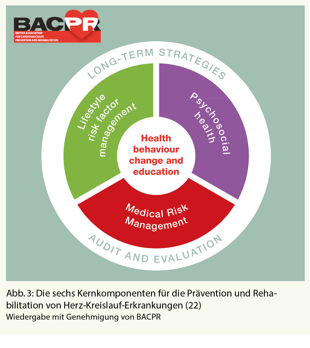 Die moderne Kardiale Rehabilitation umfasst ein weites Feld, welches aufgrund der zunehmenden Komplexität und Polymorbidität der überwiesenen Patienten eine interdisziplinäre Betreuung des Patienten notwendig macht. Eine gute Darstellung der Hauptkomponenten einer umfassenden KardioReha, ist sehr schön in der Grafik der Britischen Association for Cardiovascular Prevention and Rehabilitation zu sehen (Abb. 3).
