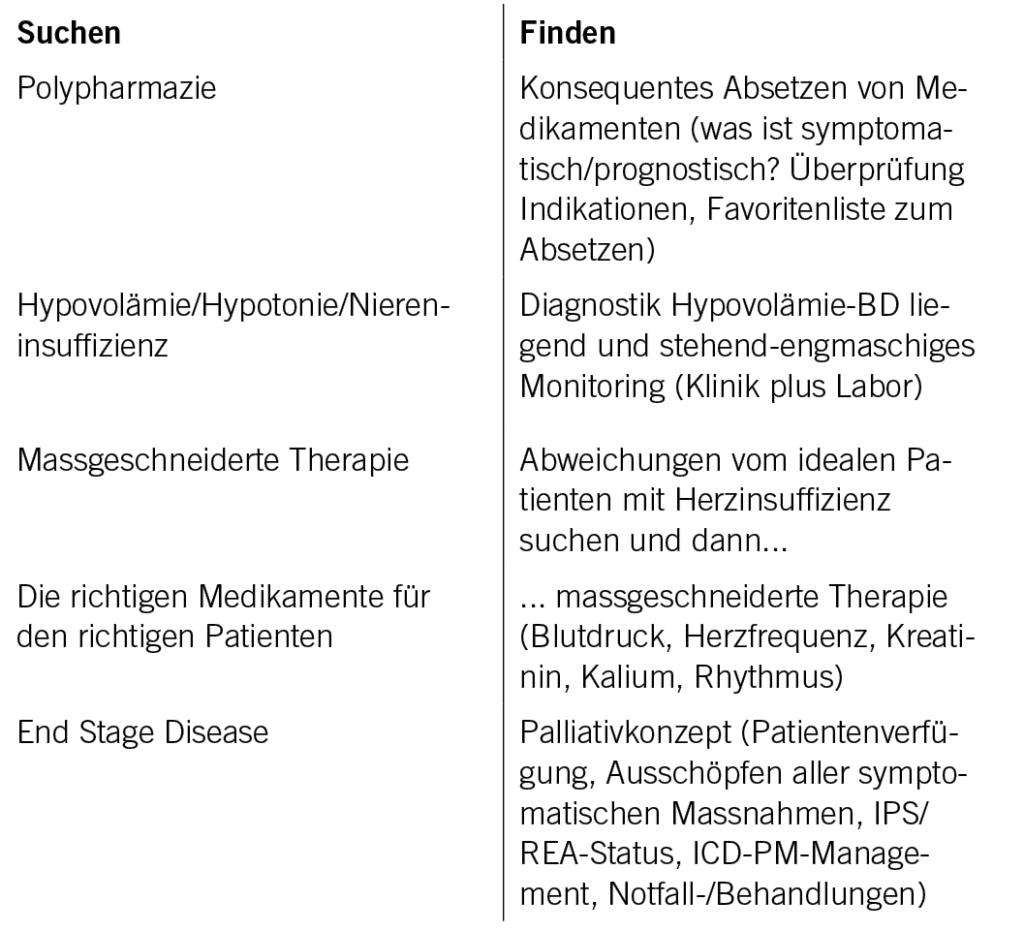 3. Reduktion und/oder bessere Verteilung der Herzinsuffizienzmedikamente, 4. Engmaschisches Monitoring (klinisch, Labor).