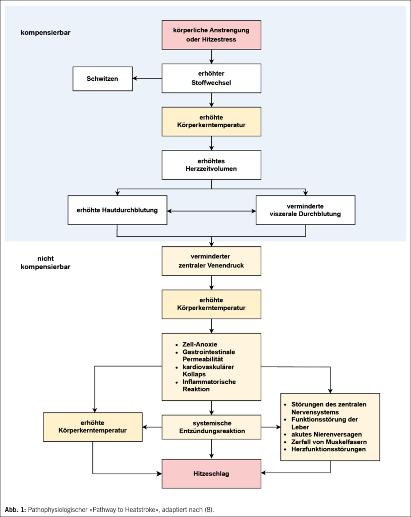 Therapeutisch gibt es beim Hitzschlag die Möglichkeit einer Kaltwasser-Immersion (Eiswasser oder Eintauchen in kaltes Wasser). Die bevorzugte Methode bei EHS. Diese ist unangenehm, führt zu einer subcutanen Vasokonstriktion mit Zittern. Letzteres dann wieder zu einer internen Wärmeproduktion. Die Überwachung gestaltet sich schwierig. In 20-40 Min. kann die Kerntemperatur auf ≤39 °C gesenkt werden. Eine weitere Möglichkeit ist der erwähnte Verdunstungswärmeverlust bei verschiedenen beeinflussenden Parametern. Der Patient wird ohne Kleider regelmässig mit lauwarmem Wasser besprüht und neben dem Patienten hat es einen Ventilator. Evaporative und konvektive Kühlung kann durch die Anwendung von Ganzkörper-Eispackungen ergänzt werden. Wichtig ist auch der iv. Volumen und Elektrolytersatz (NaCL 0.9 %, Ringerlactat, Mischinfusion). Spezifische Massnahmen je nach obiger Pathophysiologie. Zur Abklärung gehört bei Verdacht auf ein beginnendes Hirnödem ein Schädel-CT. Bei Verdacht auf ein Multiorganversagen ad IPS und Hinzuzug von entsprechenden Fachärzten (Abb. 1) (7, 8).