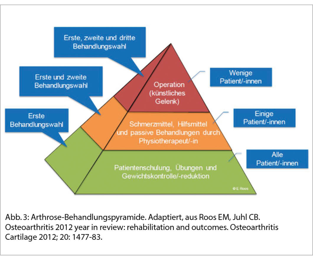 In der Erstversorgung der Gonarthrose zeichnet sich ein Trend ab weg von den medikamentösen hin zu den nicht medikamentösen Massnahmen (Abb. 3). Physiotherapeutisch ist auch bei eingeschränkter Funktion ein gut dosiertes Übungsprogramm erste Wahl. Passive Interventionen mit manuellen Techniken, Triggerpunkt- oder anderen Weichteilbehandlungen sollen nur wenn nötig und zusätzlich zum spezifischen Training erfolgen.