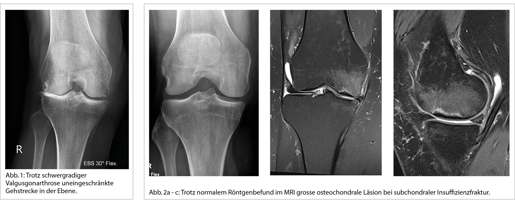 Das Krankheitsbild der Gonarthrose ist vielgestaltig. Vor der Behandlungsplanung gilt es abzuklären, in welchem Ausmass die einzelnen Gelenkkompartimente betroffen sind. Dafür sind die klinische und konventionell-radiologische Untersuchung oft ausreichend. Letztere ist nicht zwingend, zumal oft eine starke Diskrepanz zwischen der Klinik und den Röntgenbefunden besteht (Abb. 1). Zur radiologischen Beurteilung des femorotibialen Gelenkes eignen sich Aufnahmen im Einbeinstand am besten. Die Beinachse, die ligamentäre Stabilität und die muskuläre Führung sind immer mitzubeurteilen. Klinisch soll zudem geprüft werden, ob eine Aktivierung besteht, welche durch Ruheschmerzen, Schwellung, Erguss und Überwärmung charakterisiert ist. Auch die Erfassung einer sich durch myofasziale Druckdolenzen äussernden Periarthropathie ist wichtig. Gegenüber dem Röntgen erlaubt das MRI eine differenziertere Beurteilung des Knorpelschadens, des Zustandes der Menisken und nicht zuletzt auch des subchondralen Knochens. Vor allem bei plötzlichen starken Schmerzen und konventionell-radiologisch nur gering ausgeprägten Veränderungen hat das MRI einen hohen Stellenwert zur Erfassung osteochondraler Defekte, denen unter anderem subchondrale Insuffizienzfrakturen, die Osteochondritis dissecans oder auch die avaskuläre Osteonekrose zugrundeliegen können (Abb.2a - c). Manche dieser Pathologien erfordern spezifische therapeutische Massnahmen, insbesondere Entlastung. Das MRI ist auch bei Blockierungsphänomenen indiziert.