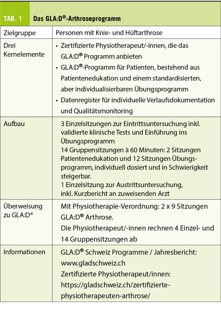 Ein Guideline-basiertes Management hat bislang gefehlt. Das GLA:D®-Arthroseprogramm schliesst diese Lücke (Tab. 1). GLA:D® (Good Life with osteoArthritis Denmark) wird international implementiert. In Dänemark gibt es seit 2013 über 55’000 Teilnehmende, in der Schweiz seit 2019 rund 3000. Die ersten Schweizer Ergebnisse zeigen, dass eine substantielle Verbesserung von Schmerzen, Analgetikakonsum, Gehfähigkeit und Lebensqualität auch ein Jahr nach Absolvieren des Programms noch anhält.