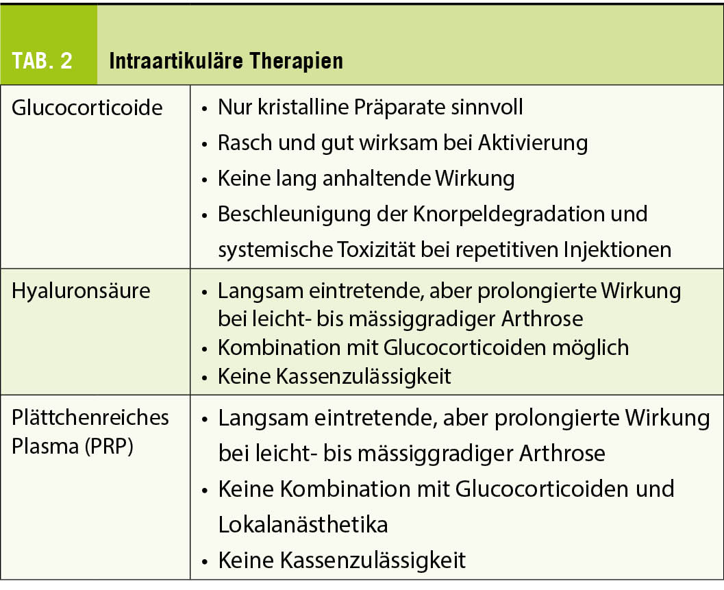 Steroidinjektionen sind bei einer Aktivierung indiziert. Wegen ihrer viel zu kurzen Wirkdauer ist von löslichen Präparaten wie Dexamethason abzuraten. Als kristalline Substanz hat sich Triamcinolon besonders bewährt; am längsten wirksam ist Triamcinolon-Hexacetonid. Für eine optimale Wirkung empfiehlt es sich, vor der Injektion den gesamten Erguss zu aspirieren und danach das Gelenk bis am folgenden Morgen soweit möglich zu entlasten. Repetitive intraartikuläre Steroidinjektionen beschleunigen leider die Knorpeldegeneration, was kürzlich für Triamcinolon-Acetonid 40 mg viermal pro Jahr nachgewiesen worden ist. Zudem haben Steroide mit ihrer systemischen Wirkung oft eine erhebliche Toxizität. Entsprechend macht es Sinn, nach Abklingen der Aktivierung andere intraartikuläre Therapiemodalitäten wie die Viscosupplementation und Plättchen-reiches Plasma (PRP) heranzuziehen (Tab. 2). Solche haben ihren Stellenwert vor allem bei einem leichten bis mässigen Grad der Gonarthrose. Bei der Viscosupplementation wird Hyaluronsäure ins Gelenk eingebracht. Die Wirkung tritt später als bei den Steroiden ein, hingegen hält sie wesentlich länger an, typischerweise 2-4 Monate. Hyaluronsäure-Präparate werden in der Schweiz nicht von den Krankenkassen übernommen, da sie als «Device» bzw. «Medizinprodukt» fungieren. Aufgrund ihrer prolongierten Wirkung muss allerdings von einem pharmakologischen Effekt ausgegangen werden. Auch bei der Hyaluronsäure-Injektion ist vorgängig eine vollständige Aspiration des Ergusses wichtig, weil sich die Wirkung dadurch verbessert. Hyaluronsäure lässt sich mit einem kristallinen Steroid kombinieren, was eine rasch eintretende und lange anhaltende Schmerzabnahme mit einer einzigen Injektion erlaubt. Hyaluronsäure kann problemlos repetitiv angewandt werden. Etwa ähnlich wirksam ist Plättchen-reiches Plasma (PRP). Dieses muss jeweils aus Eigenblut zubereitet werden und wird ebenfalls nicht von den Kostenträgern übernommen. Die Applikation soll ohne Lokalanästhetika erfolgen, damit die eingebrachten Thrombozyten nicht gehemmt werden. Eine Kombination mit kristallinen Steroiden ist nicht sinnvoll. Auch PRP kann repetitiv angewandt werden. Leider gibt es keine Prädiktoren, ob bei einem individuellen Patienten Hyaluronsäure oder PRP besser wirksam ist.