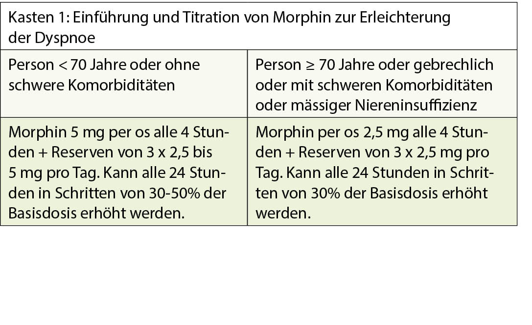 Dyspnoe, definiert als subjektives Empfinden von Atembeschwerden, ist eines der vom Patienten am häufigsten geäusserten Symptome. Sie wird oft von Sorgen und Angst zu ersticken begleitet und ist bei Menschen am Lebensende mit Prävalenzen von bis zu 75% beschrieben worden (2). Die effektivste Behandlung bleibt die Optimierung der Behandlung der zugrunde liegenden Krankheit. In dieser Hinsicht werden Behandlungen bei Herzinsuffizienz und chronisch obstruktiver Lungenerkrankung (COPD) so lange wie möglich aufrechterhalten, auch wenn das Lebensende sich nähert. In Bezug auf die symptomatische Behandlung hat sich Morphin als die wirksamste Substanz erwiesen (3). Die Wirkungsweise ist noch nicht vollständig geklärt, aber es wurden µ-Rezeptoren im Bronchialsystem gefunden. Es handelt sich also wahrscheinlich um einen Effekt, der mit dieser Medikamentenklasse zusammenhängt. Andere Wirkstoffe wie Oxycodon, sublinguales oder inhaliertes Fentanyl und Hydromorphon werden derzeit untersucht. Meistens handelt es sich dabei um kleine Studien, manchmal mit widersprüchlichen Ergebnissen. Eine aktuelle randomisierte kontrollierte Studie zeigte jedoch keinen Unterschied zwischen Oxycodon und Morphin bei chronischer Dyspnoe (4). Zusammenfassend eröffnen diese Informationen die Möglichkeit, bei persistierender Dyspnoe in der palliativen Situation auch andere Opiate einzusetzen. Die Angst vor Atemnot ist unbegründet, sofern die Substanz peroral verabreicht wird, die Dosis an die Situation angepasst ist und die Titration progressiv erfolgt (Kasten 1) (5).
