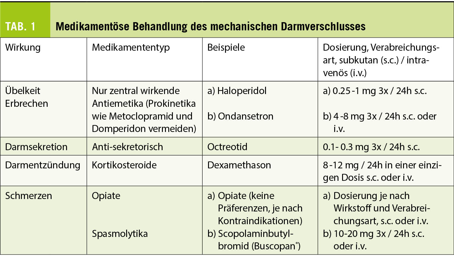 Übelkeit und Erbrechen (N/V) sind in der Palliativmedizin relativ häufig. Bei Krebs sind bis zu 70% der Patienten betroffen (14). Aber auch andere unheilbare Krankheiten wie Herz- oder Nierenversagen und COPD verursachen bei 50% der Patienten N/V (2). Einige spezifische Ursachen, wie z. B. Chemo- oder Strahlentherapie, Opiatbehandlung, gastrointestinale Erkrankungen, Stoffwechselstörungen oder intrazerebrale Erkrankungen (Metastasen, intrakranielle Hypertonie) sollten identifiziert und behandelt werden; meist wird bei diesen Patienten jedoch keine Ursache oder eine multifaktorielle Ursache gefunden (15). Metoclopramid ist das Mittel der ersten Wahl bei N/V ausgelöst durch Opioide und Stoffwechselstörungen. Das Ansprechen ist dosisabhängig und erfordert manchmal eine Titration auf bis zu 80mg/Tag (16). Bei N/V induziert durch Chemo- oder Strahlentherapie hat sich Ondansetron als sehr wirksam erwiesen (17). Die onkologischen Fachgesellschaften haben kürzlich den Einsatz von Olanzapin und Neurokinin-1-Rezeptor-Antagonisten zur Prävention von N/V infolge Chemo- und Strahlentherapie anerkannt (18). Es gibt nur wenige Fallserien in der Palliativmedizin mit Olanzapin, die aber alle einen günstigen Effekt bereits ab einer Dosis von 1,25 mg pro Tag zeigen (19). Wenn Haloperidol gegen Übelkeit nicht wirkt, wird manchmal Levomepromazin empfohlen. Dieses zeigte in einer kürzlich durchgeführten randomisierten kontrollierten Studie keinen Unterschied in der Wirksamkeit im Vergleich zu Haloperidol. Allerdings waren die Patienten unter Levomepromazin signifikant stärker sediert (20). Kortikosteroide sind bei intrakranieller Hypertension indiziert, können aber auch als Ergänzung zu anderen Antiemetika verordnet werden (21). Schliesslich ist Haloperidol bei unzureichender Kontrolle mit anderen Antiemetika und bei mechanischem Darmverschluss indiziert (22). Ein Ileus tritt bei 3-15% der Krebspatienten auf, vor allem bei Patienten mit Ovarial- (20-50 %) und Kolonkarzinomen (10-29%) (23). Abhängig von der Lage, dem Ursprung der Obstruktion, den Wünschen des Patienten und seinem Allgemeinzustand kann ein chirurgischer Eingriff in Betracht gezogen werden, einschliesslich Stenting oder Entlastungs-Gastrostomie. Meistens ist jedoch eine symptomatische Behandlung angezeigt (24). Eine Medikamentenkombination sollte auf folgende drei Achsen wirken: 1) Übelkeit; 2) Darmsekretion und -entzündung; 3) Schmerzen (25). Details zur medikamentösen Behandlung sind in Tabelle 1 ersichtlich.