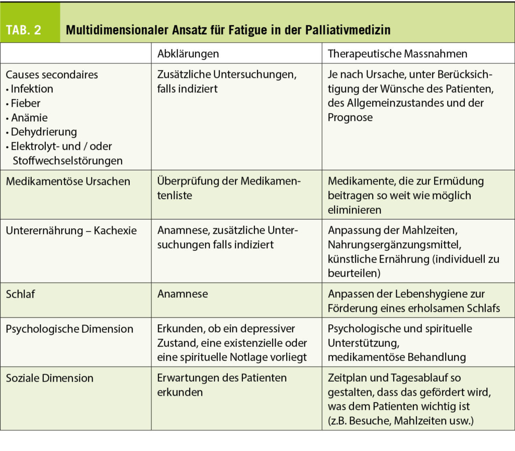 Müdigkeit kann als ein häufiges Symptom betrachtet werden, das wenig Aufmerksamkeit erhält. Dennoch kann es einen grossen Einfluss auf die Lebensqualität haben. Die Prävalenz liegt im Durchschnitt aller Erkrankungen bei etwa 60%, wobei Patienten unter Chemo- oder Strahlentherapie deutlich häufiger betroffen sind (26). Um Müdigkeit zu erkennen, schlägt die European Association of Palliative Care vor, die einfache Frage «Fühlen Sie sich ungewöhnlich müde oder schwach?» zu stellen, bevor die Ermüdung mit dem ESAS quantifiziert wird (26). Sekundäre Ursachen wie Infektionen, Stoffwechsel- und endokrine Störungen und Anämie, um nur einige zu nennen, sollten, soweit möglich und sinnvoll, abgeklärt und behandelt werden. Dies erfordert einen mehrdimensionalen Ansatz (Tab. 2). Medikamentöse Behandlungen sind eher enttäuschend und es ist vor allem körperliche Bewegung, die eine gewisse Wirksamkeit gezeigt hat (27). Es kann jedoch ein Versuch mit Kortikosteroiden (z.B. Dexamethason 4-8 mg täglich) für 5 Tage durchgeführt werden. Bei Erfolg kann die Behandlung bis zu zwei Wochen lang fortgesetzt werden; danach lässt die Wirkung nach. Andere Studien bei jungen Krebspatienten zeigen gute Ergebnisse mit Methylphenidat. Sein Nebenwirkungsprofil legt jedoch Vorsicht bei älteren Patienten nahe.