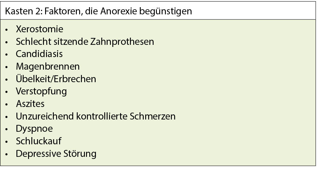 Die Anorexie ist definiert als Appetitlosigkeit oder eine reduzierte Nahrungsaufnahme. Sie kommt sehr häufig vor in der Terminalphase onkologischer Erkrankungen (85 %) (28)), aber auch bei Herz-, Nieren- oder Lungenversagen (50 %) (29)). Oft ist die reduzierte Nahrungsaufnahme eine der Hauptsorgen der Familie und eine Quelle der Angst. Die Behandlung erfolgt daher individuell nach einer gründlichen Erfassung, die nicht nur die Anamnese der Essgewohnheiten, das Vorhandensein von Faktoren, die eine Anorexie begünstigen (Kasten 2), sondern auch die Form, wie die Nahrung präsentiert wird und die Erwartungen des Patienten und seines Umfelds umfasst. Die Faktoren, die eine Anorexie begünstigen, sollten so weit wie möglich behandelt werden. In den frühen Stadien der Erkrankung kann eine künstliche Ernährung in Betracht gezogen werden. Im fortgeschrittenen Stadium (Lebenserwartung < 3 Monate) ist eine genussvolle Ernährung zu bevorzugen. Oft ist eine Anpassung der Portionen und deren Häufigkeit, der Textur, aber auch des Inhalts der Mahlzeiten notwendig. Die Hilfe einer Ernährungsberaterin kann von Vorteil sein. Orale Nahrungsergänzungsmittel sind manchmal angezeigt. Als appetitanregende Medikation kann eine Kur mit Kortikosteroiden (Prednison 0,5 mg/kg/Tag oder Dexamethason 0,1 mg/kg/Tag) vorgeschlagen werden, deren Wirksamkeit bereits nach 5 Tagen erkennbar ist, aber nach 2 Wochen nachlässt (30). Das Antidepressivum Mirtazapin zeigte in einer kleinen Pilotstudie bei Krebspatienten nach 7-wöchiger Behandlung eine Tendenz zur Appetitverbesserung. Umfassendere Studien sind noch nötig, um den Stellenwert dieses Wirkstoffs bei der Behandlung der Anorexie wirklich zu belegen (31). Andererseits vermochten weder Cannabis noch THC (Delta-9-Tetrahydrocannabinol) die Appetitlosigkeit in einer grossen multizentrischen Studie zu verbessern (32).