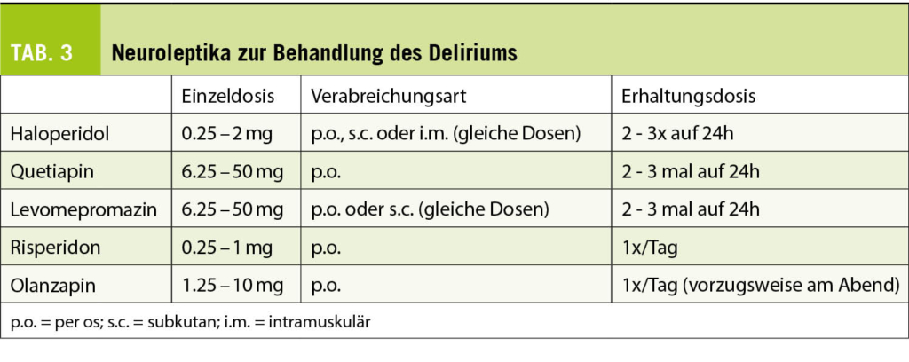 Ein solcher liegt bei 13-88% der Patienten vor, wobei die Inzidenz gegen Ende des Lebens zunimmt (33). Bei 30-50% wird der Verwirrtheitszustand durch reversible Ursachen (Infektion, Fäkalom/Verstopfung, Harnverhalt, Elektrolytstörungen, Medikamente) beschleunigt. Je nach Zustand und Prognose des Patienten können diese Ursachen gesucht und behandelt werden, während parallel dazu eine symptomatische Behandlung erfolgt. Eine aktuelle Studie, in der Haloperidol und Risperidon mit nicht pharmakologischen Massnahmen verglichen wurden, zeigte jedoch, dass letztere zur Entlastung der Patienten effektiver waren als Neuroleptika (34). Der aktuelle Trend in der Palliativmedizin geht dahin, auf den systematischen Einsatz von Neuroleptika zu verzichten. Sie sind (wahrscheinlich) immer noch in Fällen von schwerem hyperaktivem Verwirrtheitszustand indiziert, der der Person grosses Leid zufügt. Die Substanzen und Dosierungen sind in Tabelle 3 aufgeführt, wohlwissend, dass sich kein Molekül als einem anderen überlegen erwiesen hat.