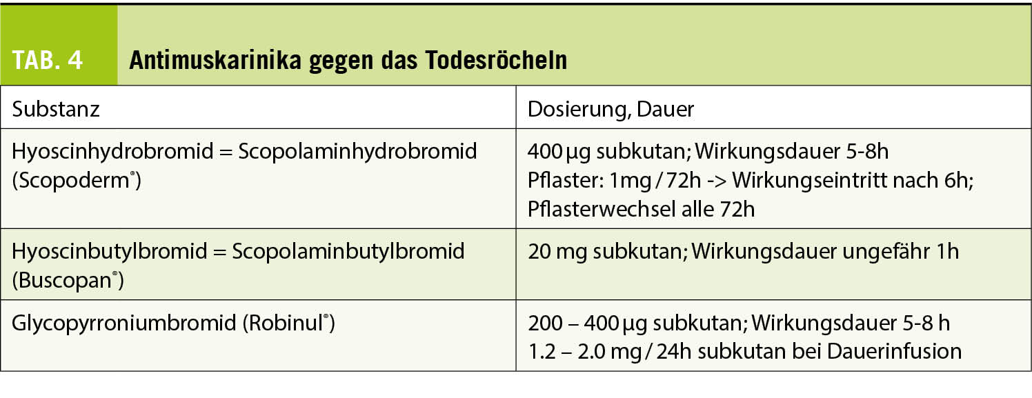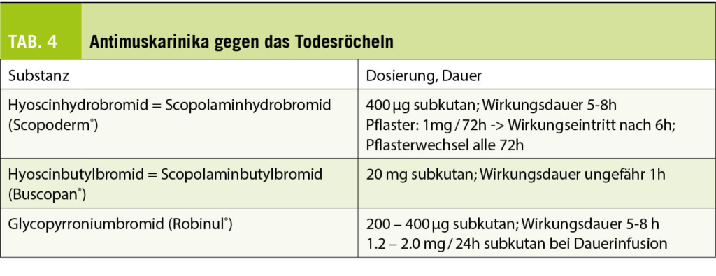 Eine starke bronchiale Obstruktion, auch als «Todesröcheln» bekannt, tritt in den letzten Lebenstagen oder sogar Stunden vor dem Tod auf. Bis zu 92% der Menschen sind davon betroffen. Bei Bewusstseinsstörungen ist der Schluckreflex beeinträchtigt, wodurch sich Sekrete in der Luftröhre und den Bronchien sammeln können. Die vorbeiströmende Luft erzeugt oszillierende Schwingungen, die als Rasselgeräusche wahrgenommen werden. Diese Stauung ist nicht zu verwechseln mit der alveolären Stauung aufgrund einer Lungeninfektion oder kardialen Dekompensation. Obwohl dieses Geräusch für Angehörige sehr störend sein kann, gibt es keinen Hinweis darauf, dass diese Rasselgeräusche dem Patienten Unbehagen bereiten. Eine medikamentöse Behandlung ist daher nicht unbedingt erforderlich (35). In erster Linie ist es wichtig, den Kontakt und die Kommunikation mit den Angehörigen zu suchen, um sie zu beruhigen. Ist jedoch eine Reduktion dieser Sekrete erwünscht, kann ein Versuch mit einer Behandlung mit Antimuskarinika unternommen werden, auch wenn die Wirkung dieser Substanzen gegenüber einem Placebo nie nachgewiesen wurde (36). In der Schweiz sind drei Substanzen verfügbar (Tab. 4). Eine weitere Möglichkeit ist die mechanische Absaugung, die sparsam eingesetzt werden sollte, da bei wiederholter Anwendung die Gefahr eines Traumas besteht.
